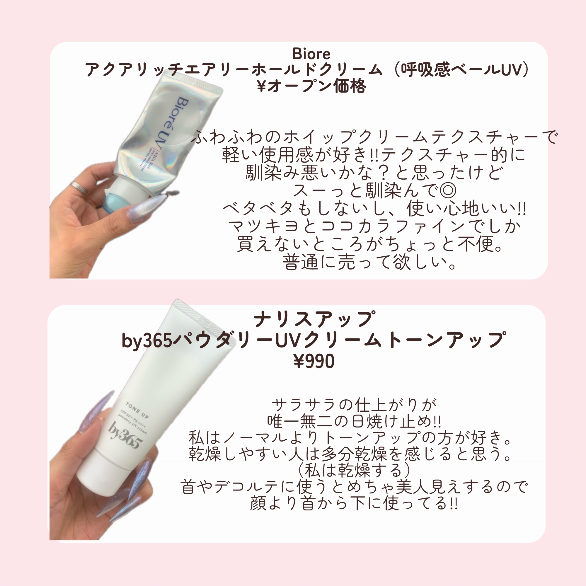 LIPS2025年上半期ベスコス語ってみた②//なんか今回の上半期のベスコスかなり持ってるものが多かったのでまた語ってみました。今回はコスメ以外が多いよ。◎RMKRMKUVフェイスプロテクターエンハンスト¥3,850みずみずしく軽いテクスチャーの日焼け止め。香りも良いしなんか塗ったっけ?と思うほど付け心地いい。これ使うとファンデの密着力上がる気がするし、ベースメイク崩れにくくなる!!過度なトーンアップがにがてな人にもおすすめなUV下地。◎FloraNotisJILLSTUARTフローラノーティスジルスチュアートチェリーブロッサム コンフォートUVセラム¥3,630みずみずしい美容液仕立てのUVセラム。日焼け止めとは思えないようなテクスチャーとすんごい良い香りが大好き。香り付きだけど、顔に塗っても不快に思わないちょうど良い強さも◎テクスチャー的に長時間外にいる時は向かないので短時間の外出や室内が多い時の方が向いてると思う!!使用感いいので毎日メイクに使いたいやつ◎ビオレアクアリッチエアリーホールドクリーム(呼吸感ベールUV) ¥オープン価格マツキヨ・ココカラファイン限定の日焼け止め。ホイップクリームテクスチャーが使い心地良くて日焼け止め苦手な人にも使いやすいと思う!!トーンアップも自然だし、結構好き!!マツキヨとココカラファインでしか買えないところに不便さを感じる🤣どこでも売って欲しい!!◎ナリスアップby365パウダリーUVクリームトーンアップ¥990ぽてさら日焼け止めのトーンアップ版。私はノーマルタイプよりトーンアップの方が好き!!この日焼け止めは焼けにくいのもポイント!!サラサラに仕上がるのは好きだけど、乾燥肌や肌の調子悪いと乾燥を感じやすい。これから真夏になったらもっと使いやすいと思う!!◎ファンケルスキンコンディショニング洗顔¥1,595洗う水を味方につける“保水膜”洗顔。どの肌質の人にもおすすめできる洗顔だと思う!!泡切れいいし、つっぱらないのにヌルヌルしない。これは本当名品だと思う!!使ってない人、1度は試して欲しい!!◎アクアレーベルエステ洗顔ジェル ¥オープン価格毛穴ケア&クレンジングとしても使えるジェル洗顔!!乾燥肌の人って毛穴ケア系使うと合わないの多いからそこは嬉しいかも!!ただクレンジングとしてはあまりおすすめしないかも。メイク濃いと落とすの時間かかるし摩擦が気になる。クレンジングとして使うならナチュラルメイクさんかな?あと結構ジェル切れ(?)が良くないので流すのに苦労するかも。◎キャンメイクスタイリングエッジアイブロウ01ナチュラルブラウン ¥770某デパコスに激似のナギナタ型のアイブロウ。最初は慣れないと描きにくいけど慣れると1本1本自然に描けるよ!!なめらかな描きごこちも良いしなかなか減らないのでコスパもいい!!芯も折れにくいからこれは名品間違いなし👏◎CEZANNEシェーディングペンシル ¥660流行りのカニ味噌系が¥660で買えるのはすごい!!ぼかしやすいし、落ちにくいし良いんだけど、私はどうしてもパウダーシェーディングの方が使いやすい!!スティックタイプだから細かいところを削りやすいよ!!悪くはないけど、多分リピしないかな。…という感じで、上半期のベスコス語ってみた②でした。次回、語ってみた③で終わり予定。③は大量よ。気になったらみてね👋お買い物の参考に…❤️#LIPSベスコスを語ります#プチプラコスメ#新作コスメ#プチプラ#紫外線対策#アイブロウペンシル#眉メイク#角栓ケア#クレンジングジェル#毛穴の黒ずみ#ベスコス#日焼け止め#マツキヨ