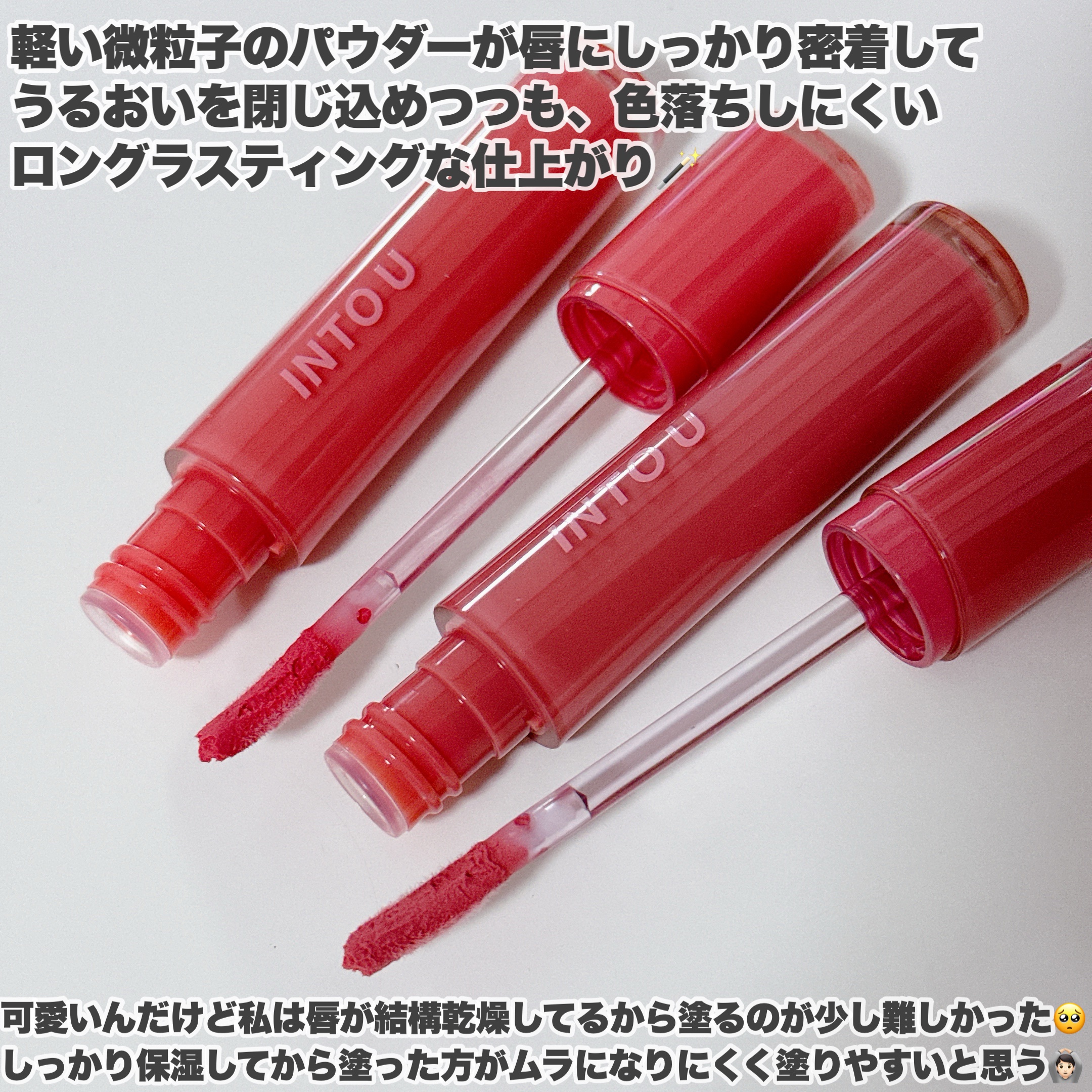 両方とも使いやすいリップで色も可愛い! ティントだから色もちもいい。 少し前にリールでもあげたけど、色の違いわかりやすいようにこっちでも残しておきます。 ちなみに税込1540円です。