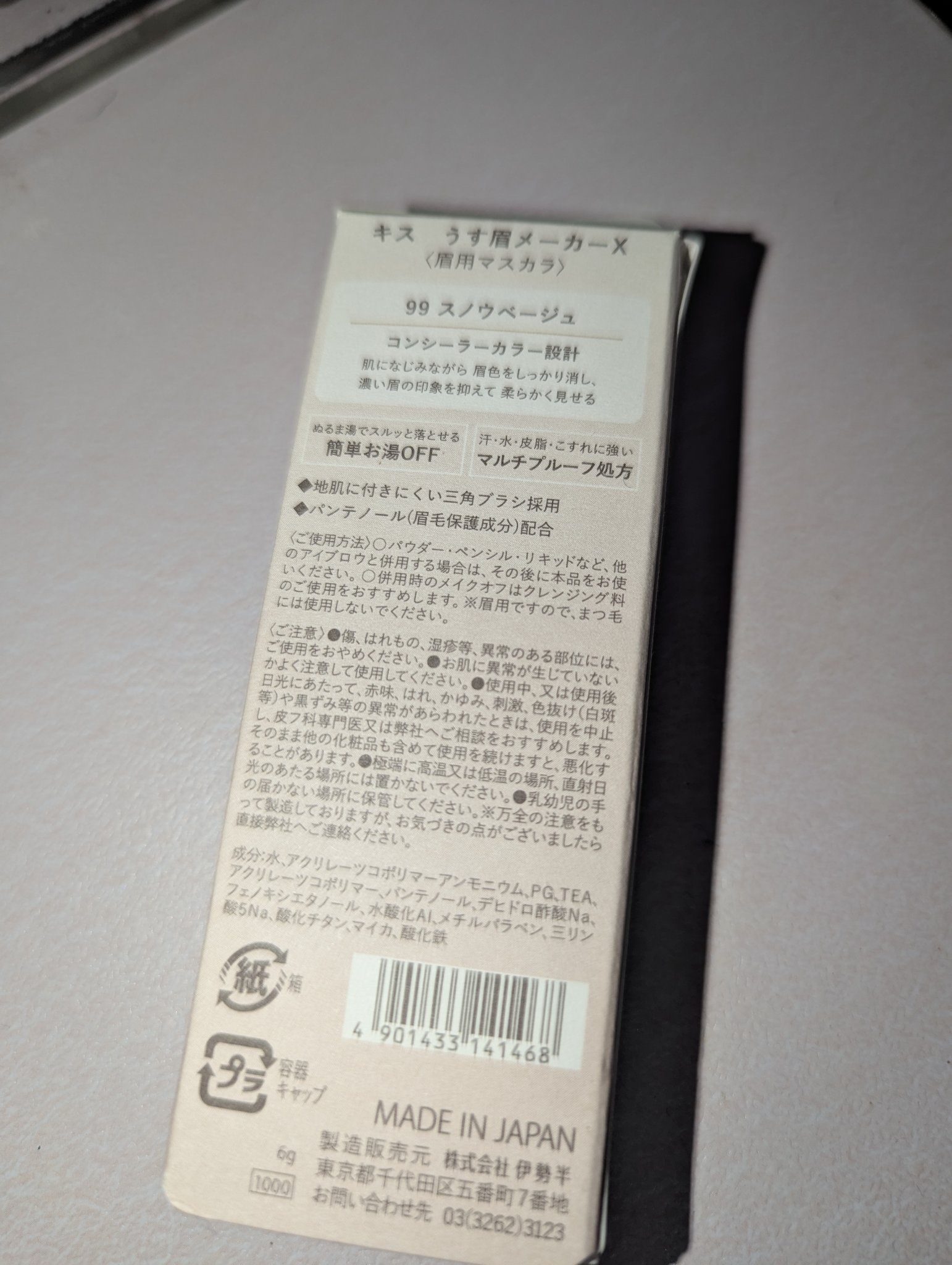 - 〈数量限定〉 濃い眉も、ひと塗りで柔らか眉に仕上げるアイブロウマスカラ 肌馴染みの良さはそのままに、より明るい色に仕上がる限定カラー X99 スノウベージュ:眉の黒さをしっかり抑える、地肌に限りなく近い明るさのホワイトベージュ。 キス独自のコンシーラーカラー設計 ◇肌に馴染みながら眉色をしっかり消し、濃い眉の印象を抑えて柔らかく見せます。 描きすぎた眉も、ひと塗り重ねるだけでふんわり眉に ◇濃くなりがちな眉メイクも、ひと塗り重ねるだけで、色素の薄い抜け感のある眉に仕上がります。 地肌に付きにくい三角ブラシ ◇スリムな先端で、細部までピンポイントに塗りやすい三角ブラシを採用。 色ムラにならず、均等に色付きます。 ぬるま湯でスルッと簡単に落とせるフィルムタイプ 汗・水・皮脂・こすれに強いマルチプルーフ処方 パンテノール(眉毛保護成分)配合