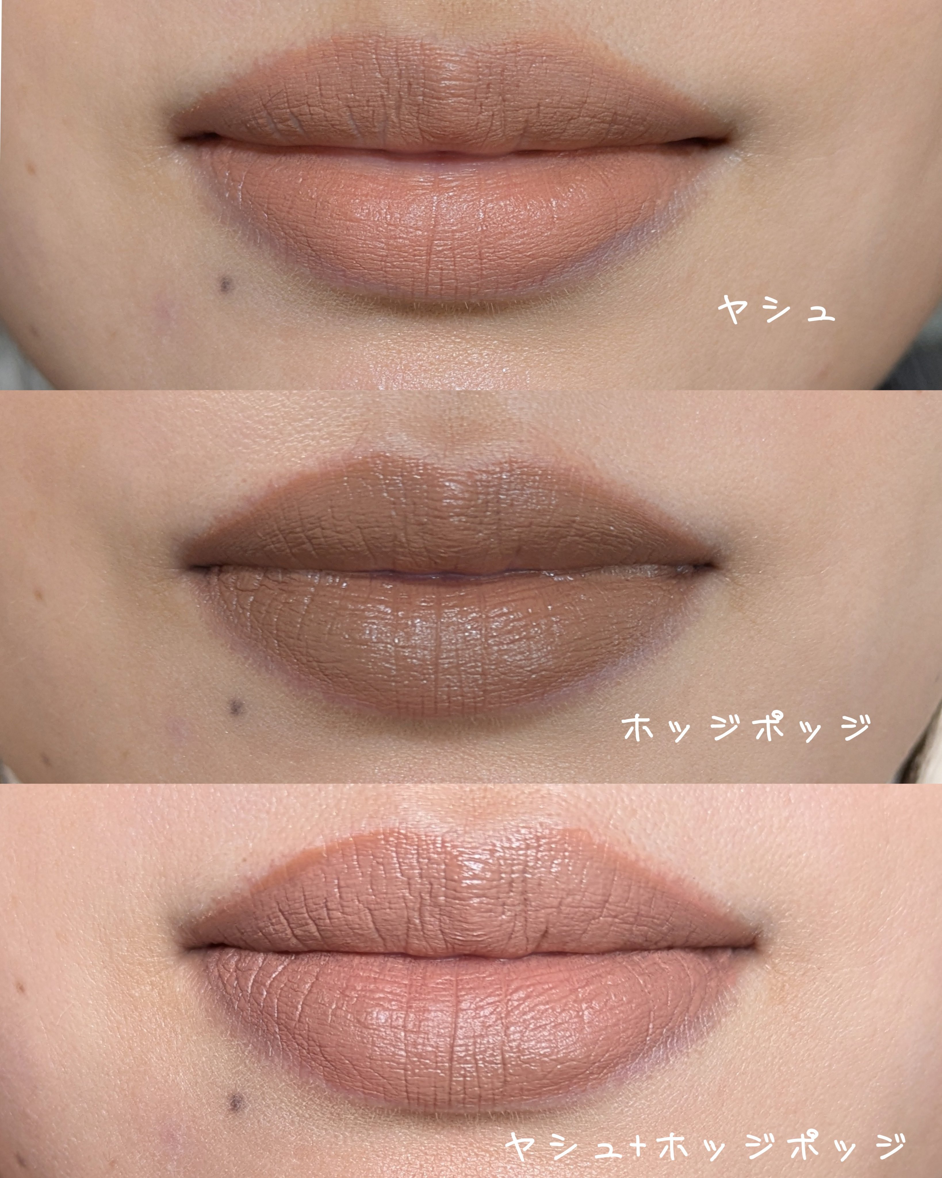 セルヴォークのヌードモカが黄味も赤みもくすみもちょうど真ん中でした。 質感全然ちがうしどれもおすすめです💄 唇に付けるとヌードモカは中間色な感じなのですが、スウォッチの写真だとホッジポッジのが色味が近い気がしました! ホッジポッジのが暗めでグレー味がある気がします。