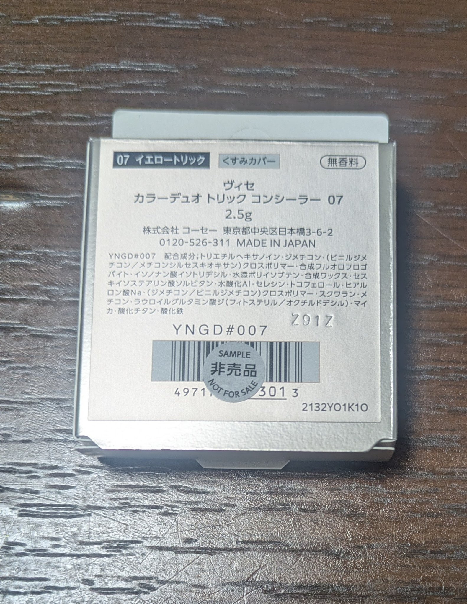 Viséeカラーデュオトリックコンシーラー07イエロートリックシミ・クマ用に購入。塗布後はしっとりと素肌っぽいツヤ感があり、厚塗り感が出ない。なじみよく仕上がりが自然で美しい。塗りやすい柔らかさがありつつ、さらっとした塗り心地、ぴたっと密着する。◯イエロー…赤みの無い場所のシミ 青クマ・黒クマ 剃毛後の青みが気になる箇所 小鼻の赤み 塗った場所を明るくできる。 ハイライト使いもできそう。◯アプリコット…頬の赤みのある箇所のシミ ほんのり赤みがあるカラーが、チークを塗った後の頬にも丁度よく馴染む。 血色不足が原因のクマにもよさそう。