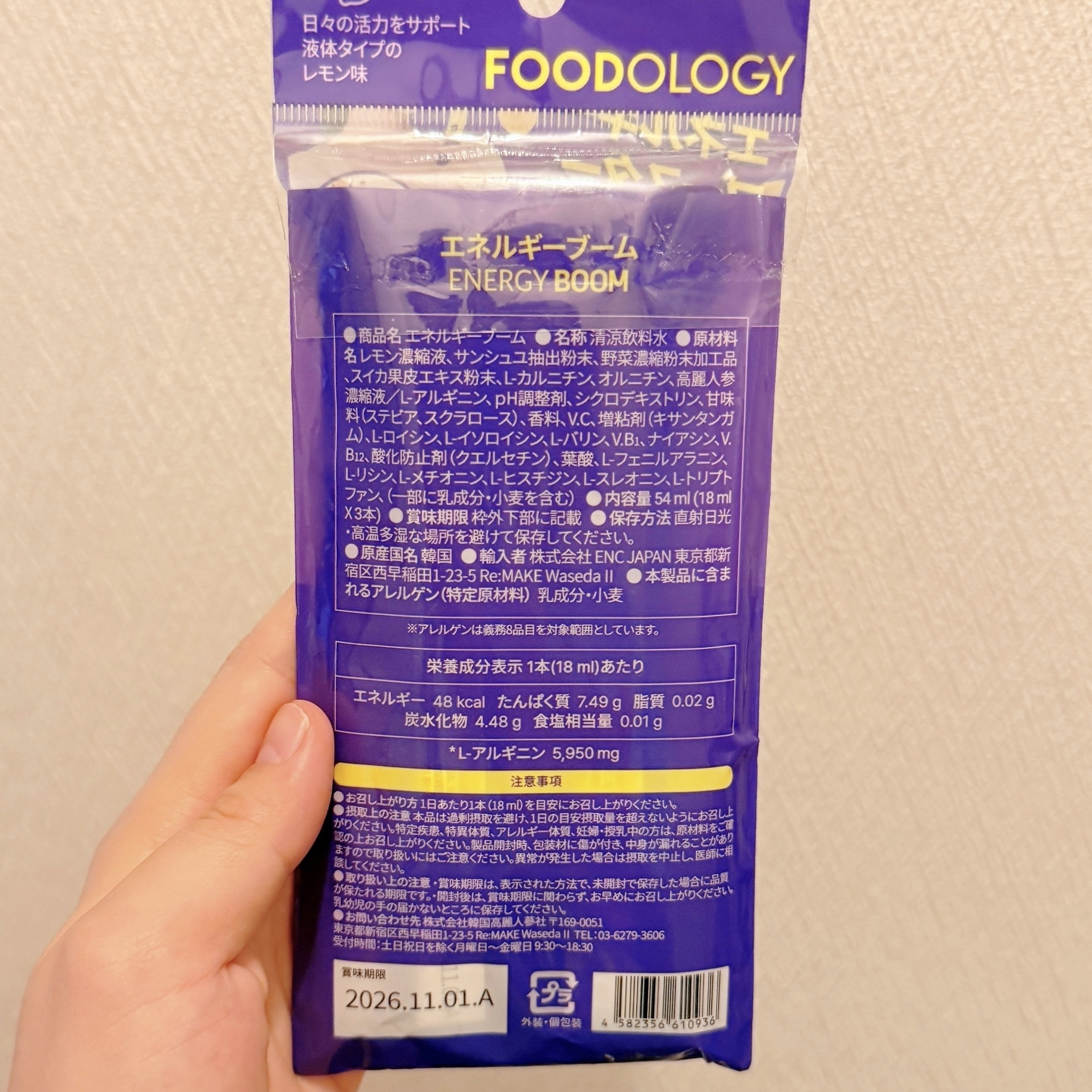 【疲れが吹き飛ぶお守りアイテム⚡️】FOODOLOGYエネルギーブームOPP18mlx3本アインズアンドトルペの韓国コスメコーナーにて販売してて目に止まったので購入しました✨✨最近疲れがちな私にぴったり🥹🥹L-アルギニンをたっぷりと含んでるので活力アップを目指せるアイテムらしい⚡️⚡️なんとびっくり。1本5,950mgとたっぷり配合されてる…😳ドロっとした液状のサプリメントで手軽に摂取できるのも魅力。味は私は飲みやすいと思ったけど味が濃い&ドロっとしてるので炭酸水とかで割っても美味しく飲めるかなと☺️☺️疲労感もいつもより少し治まったかな?なんて思うので試しに継続してみようかと👌#FOODOLOGY#インナーケア#韓国美容#サプリ