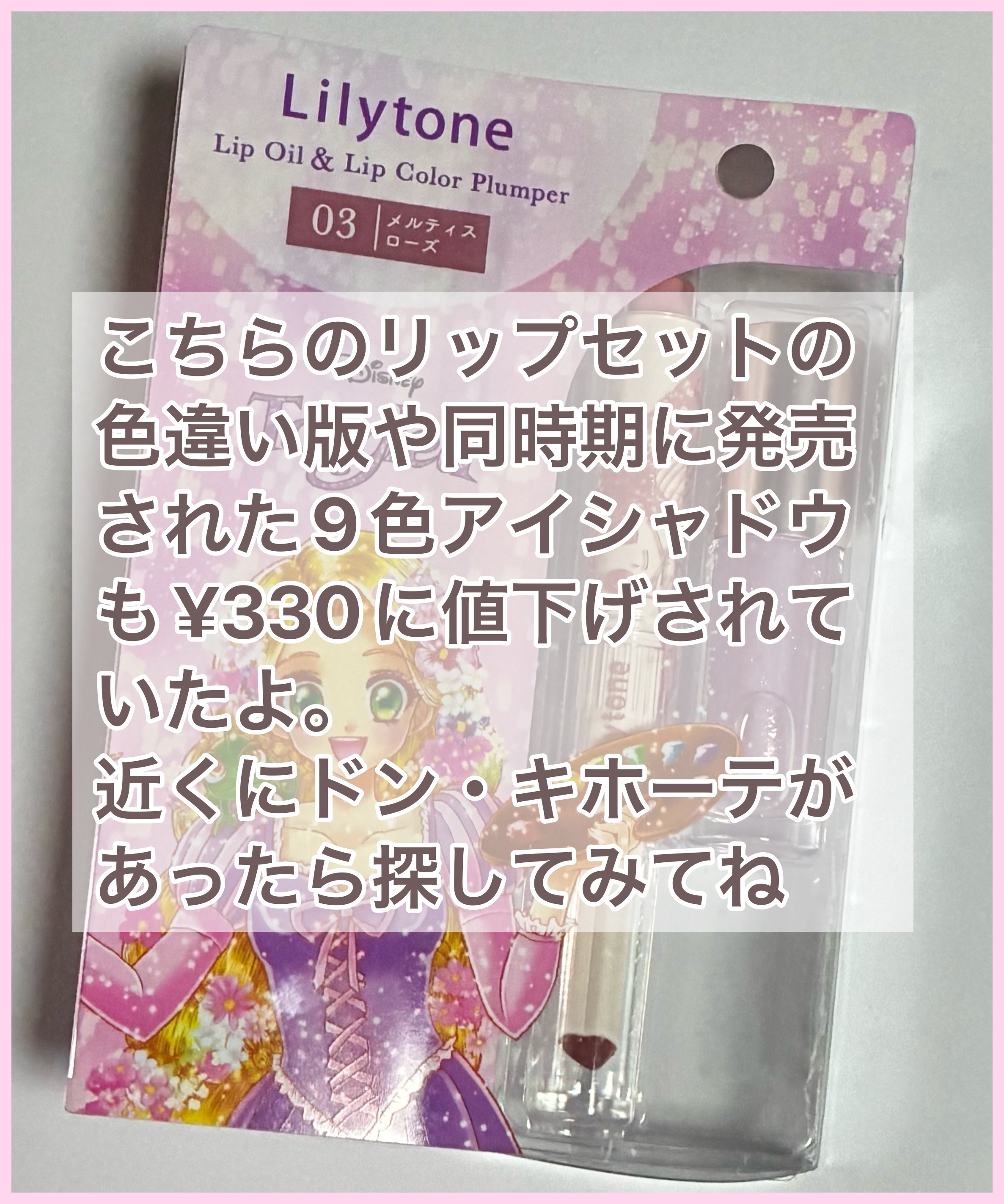 Lilytoneリップセットメルティスローズ¥1,485☑︎¥330※値下げ価格☑︎ドン・キホーテのコスメブランド「Lilytone」☑︎中川翔子さん描き下ろしアートを使用したラプンツェルシリーズ(数量限定)────────────2024年12月中旬頃に発売されたLilytoneラプンツェルシリーズの限定コスメが全部¥330にされて並んでました😳リップセットの色違いはもちろん、9色アイシャドウも…。リップもアイシャドウも可愛いものはなんぼあっても良い派の人もそうじゃない人も興味が出たらドン・キホーテさんで探してみてね!#プチプラコスメ#ドンキコスメ#ドンキ#リッププランパー#リップオイル#ディズニープリンセス#コスメ購入品#アウトレットコスメ