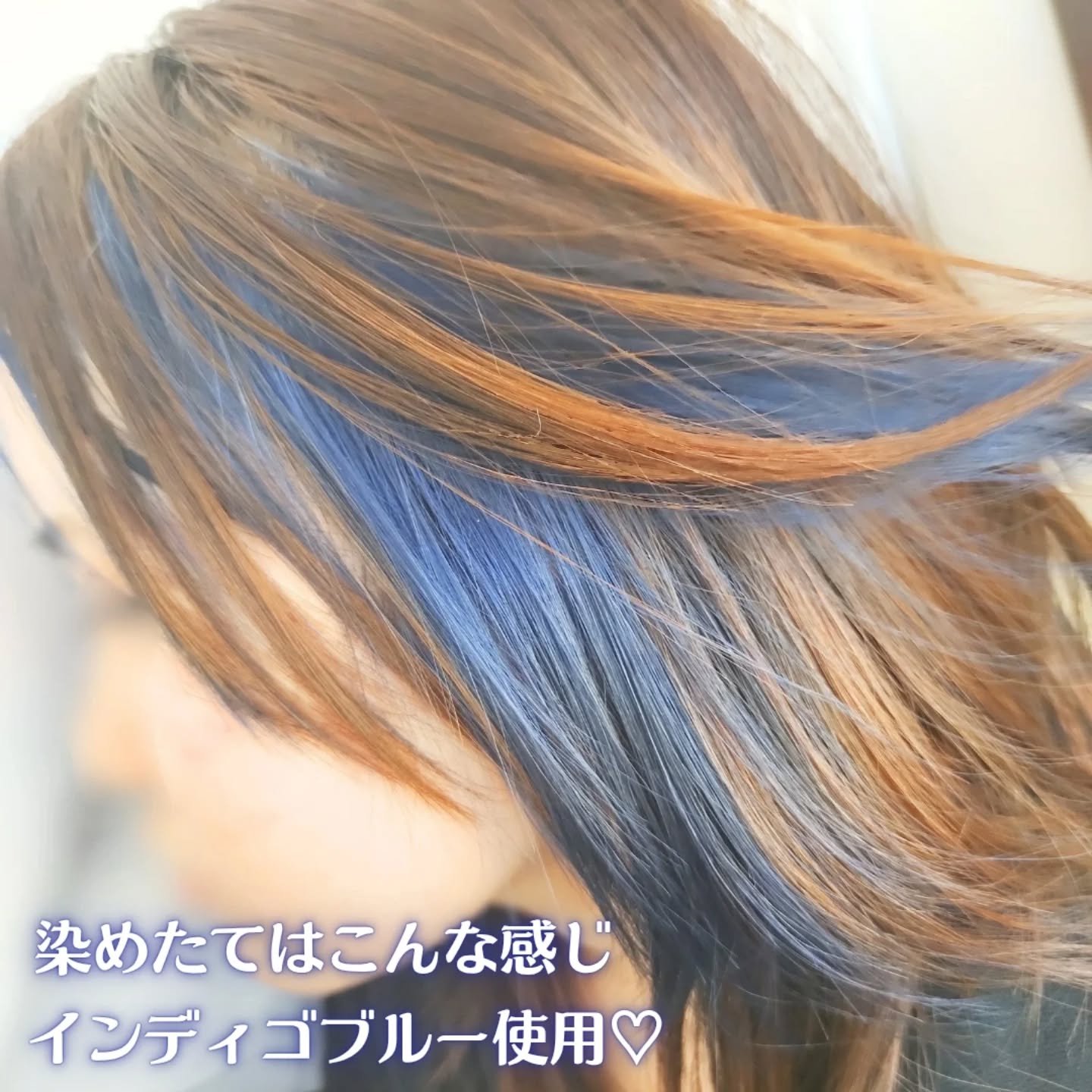 カラーを入れる前のベースアップブリーチとして、見た目に色の変化が分かりやすくて良い👍 その後2週間ほど色を楽しみながら過ごして、ブリーチした髪に色入れ(エクスチェンジカラーのインディゴブルーを塗布)ました。 香りもジューシーなグレープみたいな🍇香りでわたしはとっても好きでした⭕️ カラー後は、お仕事で会ったスタッフさんたちに、ブルーカラーがステキィ〜♡と言われたので🤭 以前からブリーチを重ねていた毛先は透けるようなインディゴブルーの色で、頭頂部は暗めなインディゴブルーで、ナチュラルなグラデみたいな感じになりました👍