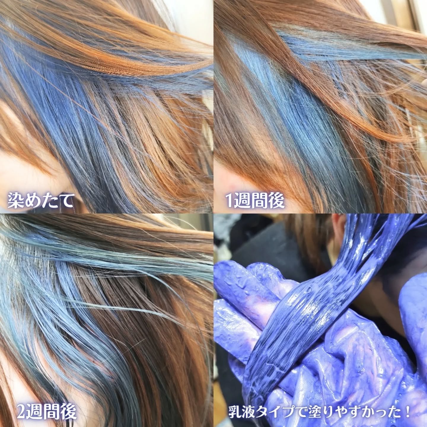こちらの商品の特長は、【色残りがしにくい処方】になっていて発色・色持ちは従来のヘアカラーと変わらないのにエクスチェンジカラー処方採用でカラーチェンジを楽しめるみたいです👀 テクスチャーは乳液タイプになっていて、揉みこむと泡立って髪全体に行きわたるやすいと思いました♪ ビューティーンベースアップブリーチを使用してから、ビューティーンエクスチェンジカラーのインディゴブルーを使ったのでしっかりと青みを感じる色合いで良かったです🙆♀️