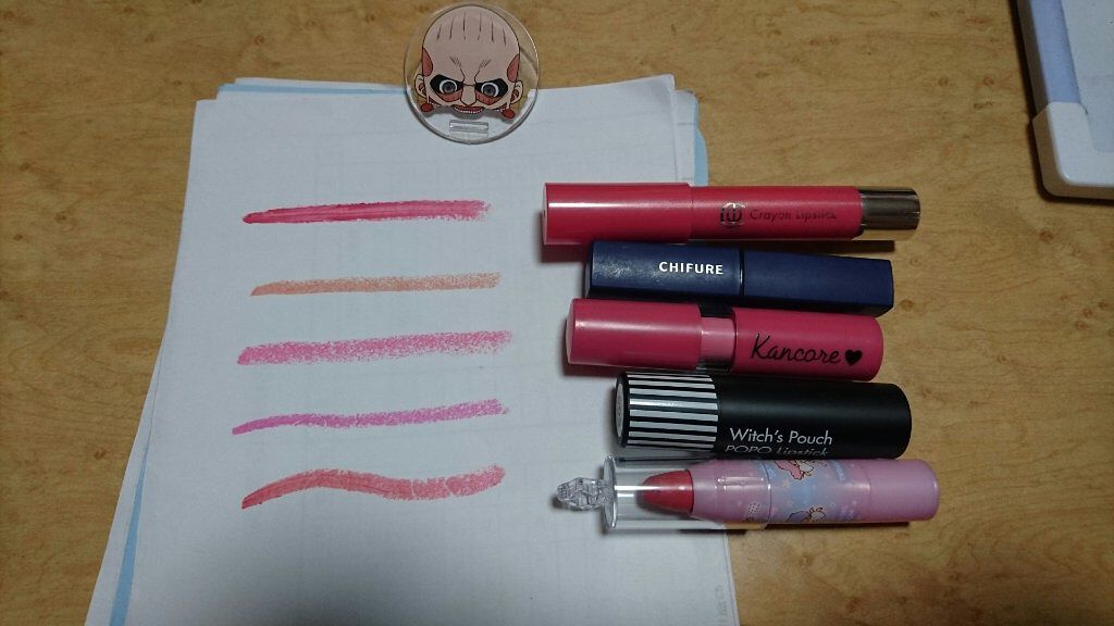 リップ見せます100均が多いです100均ACクレヨンリップ05サーモンピンク使いやすく自分も愛用中☺100円と安いので買いやすい!カンコレマットリップステックローズまだ使ったことは無いが、紙に試し塗りをしたら色が綺麗😍ケースも可愛く、また見つけたら買おうと思いますキキララシャイニーリップこれもまた可愛い💕発色はピンクと言うよりオレンジ系?ちふれ知り合いに頂いたものでまだ使ってなく使うのが勿体ない!発色はオレンジにしか見えない笑ウィッチズポーチポポリップスティックケースに保管試し塗りのために開封しました💦発色可愛いピンクS09の色です❤️説明下手ですいません💦#100均#ちふれ#ウィッチズポーチ#キキララ#ダイソー