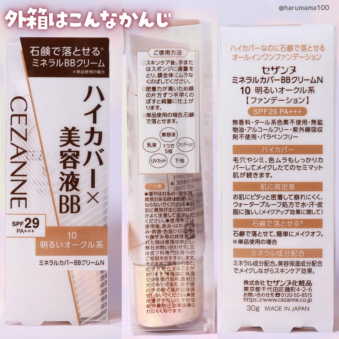 CEZANNE.。.•*¨*•♬✧.。.•*¨*•♬✧.。.•*¨*•♬✧.。.•*¨*•♬ミネラルカバーBBクリームN10/明るいオークル系¥748.。.•*¨*•♬✧.。.•*¨*•♬✧.。.•*¨*•♬✧.。.•*¨*•♬水分量といいますか、保湿力が低く乾燥肌の自分には崩れやすかったです(化粧浮きが気になった)商品説明※単品使用の場合●毛穴やシミ、色ムラもしっかりカバーしてメイクしたてのセミマット肌が続きます。●水・汗・皮脂に強いウォータープルーフタイプ。(メイクアップ効果に関して)●石けんで落とせます(単品使用の場合)。●SPF29 PA+++●ミネラル成分と12種の美容保湿成分配合。メイクしながらスキンケア効果がある、まるで美容液のようなBBクリーム。●クリームタイプのファンデーション。明るいオークル。●タール系色素不使用、無鉱物油、アルコールフリーサイト引用リピートする予定は今のところありません🥹