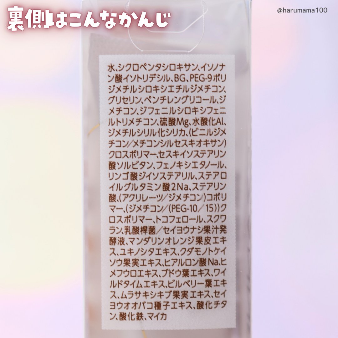 - 水、シクロペンタシロキサン、イソノナン酸イソトリデシル、BG、PEGー9ポリジメチルシロキシエチルジメチコン、グリセリン、ペンチレングリコール、ジメチコン、ジフェニルシロキシフェニルトリメチコン、硫酸Mg、水酸化Al、ジメチルシリル化シリカ、(ビニルジメチコン/メチコンシルセスキオキサン)クロスポリマー、セスキイソステアリン酸ソルビタン、フェノキシエタノール、リンゴ酸ジイソステアリル、ステアロイルグルタミン酸2Na、ステアリン酸、(アクリレーツ/ジメチコン)コポリマー、(ジメチコン/(PEGー10/15))クロスポリマー、トコフェロール、スクワラン、乳酸桿菌/セイヨウナシ果汁発酵液、マンダリンオレンジ果皮エキス、ユキノシタエキス、クダモノトケイソウ果実エキス、ヒアルロン酸Na、ヒメフウロエキス、ブドウ葉エキス、ワイルドタイムエキス、ビルベリー葉エキス、ムラサキシキブ果実エキス、セイヨウオオバコ種子エキス、酸化チタン、酸化鉄、マイカ
