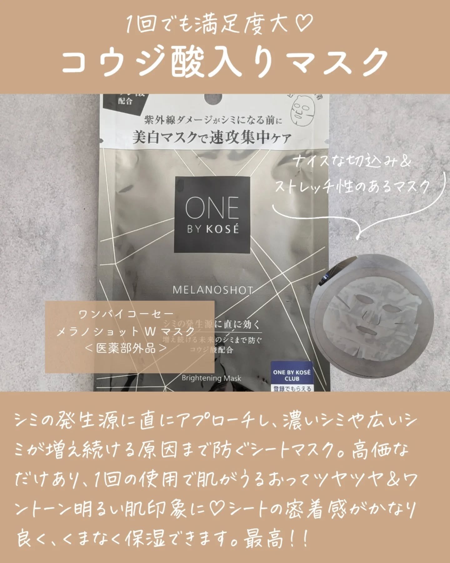 ☑ONEBYKOSEメラノショットWマスク 21mL×1枚入 ¥1430美白有効成分「コウジ酸」がメラニン生成を抑制し黒色化を防いでくれる美白マスクお値段なんと1枚¥1430の高級マスク正直高いし、効果わからなくて。。これを買うなら同じシリー...