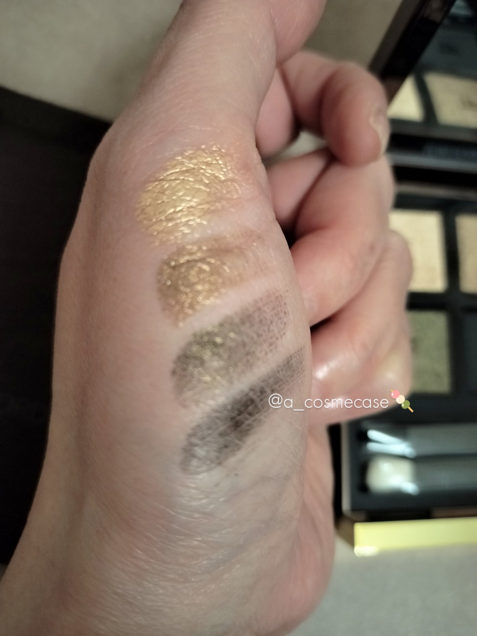 ベルベットのような柔らかい粉質で発色◎ ぎゅっと密度が高いパールの濡れツヤ感がめちゃくちゃ綺麗! ゴールド×オリーブは使いやすいし絶対可愛い 華やかな且つかっこいい雰囲気だし 煌めくピーチカラーがこれからの季節にもぴったり 日常使いできるパレットですね🫶
