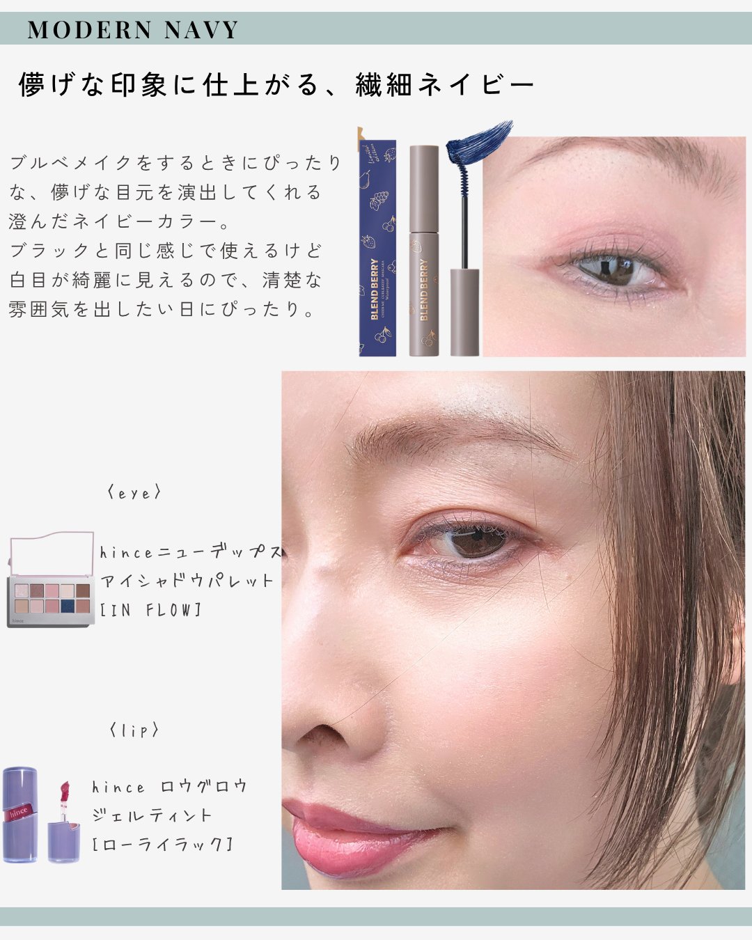 BLENDBERRYチアミーカール&キープマスカラWP001エナジーブラック002メリーブラウン101モダンネイビー(限定色)鹿の間さんとコラボしているBLENDBERRYのマスカラ!25°のフィットブラシで、細かいまつ毛も簡単にキャッチしてくれて、束感カールロック処方で、まつ毛をダマなく伸ばし長時間キープしてくれます。ウォータープルーフ処方で繊維入りのマスカラが好きなので嬉しい!目頭や目尻の細かいまつ毛や短いまつ毛にも塗りやすいです。長さを出しながら束感が作れて良いです。どれも色味が可愛くて、特にモダンネイビーはパール感があり、1番気に入りました!#PR#CHEERMELASH#チアミーラッシュ#ブレンドベリー#BLENDBERRY#垢抜けメイク#束感まつ毛#マスカラ