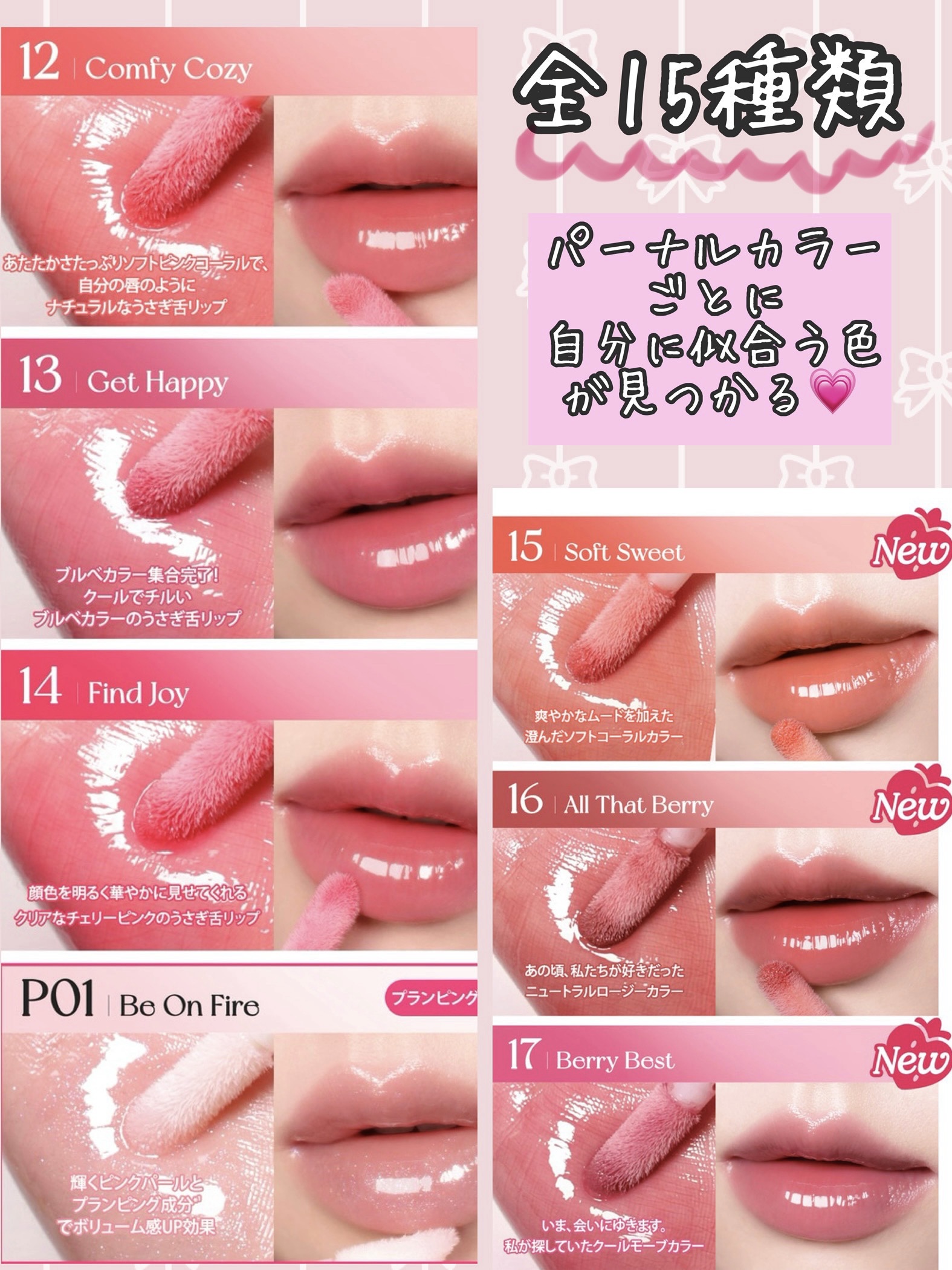 ベタつかずグロッシーなツヤ✨️ グロスなのにあまりベタつかずにツヤ感を楽しめて良かったです😊 いちごミルクの香りがもう可愛くて可愛くて... それだけで癒されます。 カラー展開が15色と豊富なので、自分に合いそうなカラーを見つけてみてください!