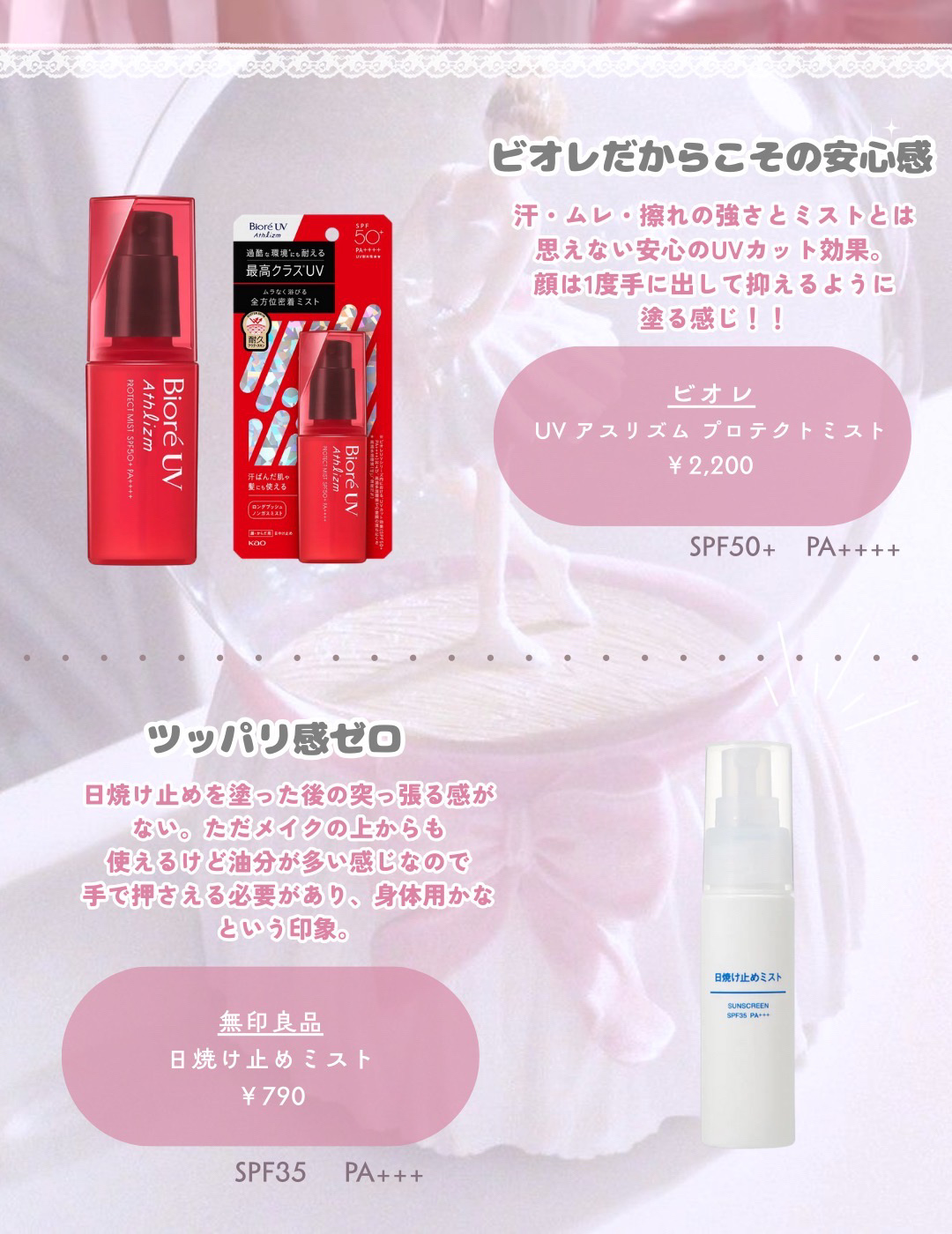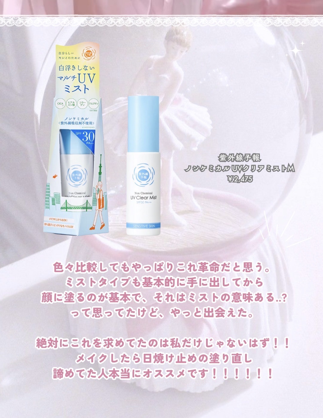 \手が汚れない日焼け止め比較/メイクの上から使える日焼け止めが神だった🎀この夏日焼けしたくない人見て。୨୧┈┈┈┈┈┈┈┈┈┈┈┈┈୨୧今年も日差しが強くなる季節が来た.....!!!!!!日中メイクの上から塗り直せるミスト・スティックの日焼け止めを追い求めてたけどめちゃくちゃ理想なの見つけた!!!!!!!!😭🫶🏻🫶🏻🫶🏻🫶🏻紫外線予報ノンケミカルUVクリアミストMLIPSのイベントのPOPUPで出会ったんだけど、メイクの上からでも直接顔に使えますって言われて天才!!!!!!!!ですね!?!?ってなった😂😂🫶🏻ミストタイプの日焼け止め結構出てるけど、ほぼ全部1度手に出してから顔に塗るかんじでそれはミストの意味あるのか、、、!?!ってなってたから直接顔に使えるの嬉しい!最高!😂👍🏻👍🏻👍🏻余裕でリピ買いします👍🏻👍🏻👍🏻👍🏻しかも紫外線予報さんのポンプ式の日焼け止め愛用してるから安心感めっちゃある!!!!!!アネッサのパウダータイプの日焼け止めもめちゃくちゃ気になる....!!!!!!!!重ねても粉っぽくならないのかな...!?!??これも買ったらまた別でレビューしたいなと思います!!ぜひ参考にしてみてください!!!!