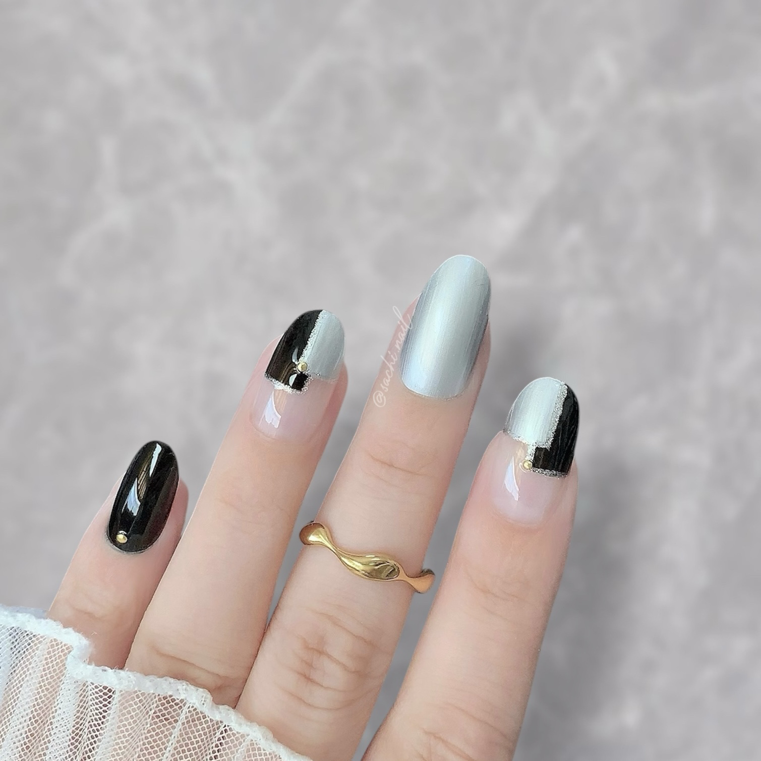 メンズネイルにもおすすめ🖤クールなブロックネイル💅Howtoは3枚目に😘中指は303番を2度塗り、小指は071番を2度塗りして根元にスタッズをつけました✨少しでも参考になれば嬉しいです♥️#セルフネイル#ポリッシュ#マニキュア#ブロックネイル#冬ネイル#シンプルネイル#簡単ネイル#プチプラネイル#キャンメイク#2026年初買いアイテム
