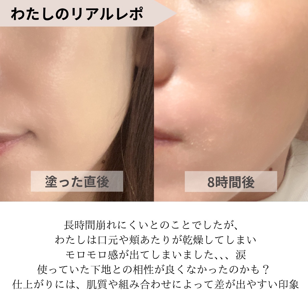 薄く重ねつけしていくと綺麗に塗れる印象。 一気につけると厚塗り感が出ちゃったり、伸びが良いから余ったりして結果厚塗り感出やすい印象💦 赤み、毛穴のカバーしやすかった✨ 薄く薄く重ねていくと赤みをカバーしやすい✨ 汚い崩れ方にならずに帰宅できた。 私自身が乾燥肌なのもあるけど、冬だから皮脂は出にくいから、うっすら皮脂と馴染んで綺麗に見えてちょっと時間経つと”なんかいい感じ“って見えて良きでした🙆♀️✨