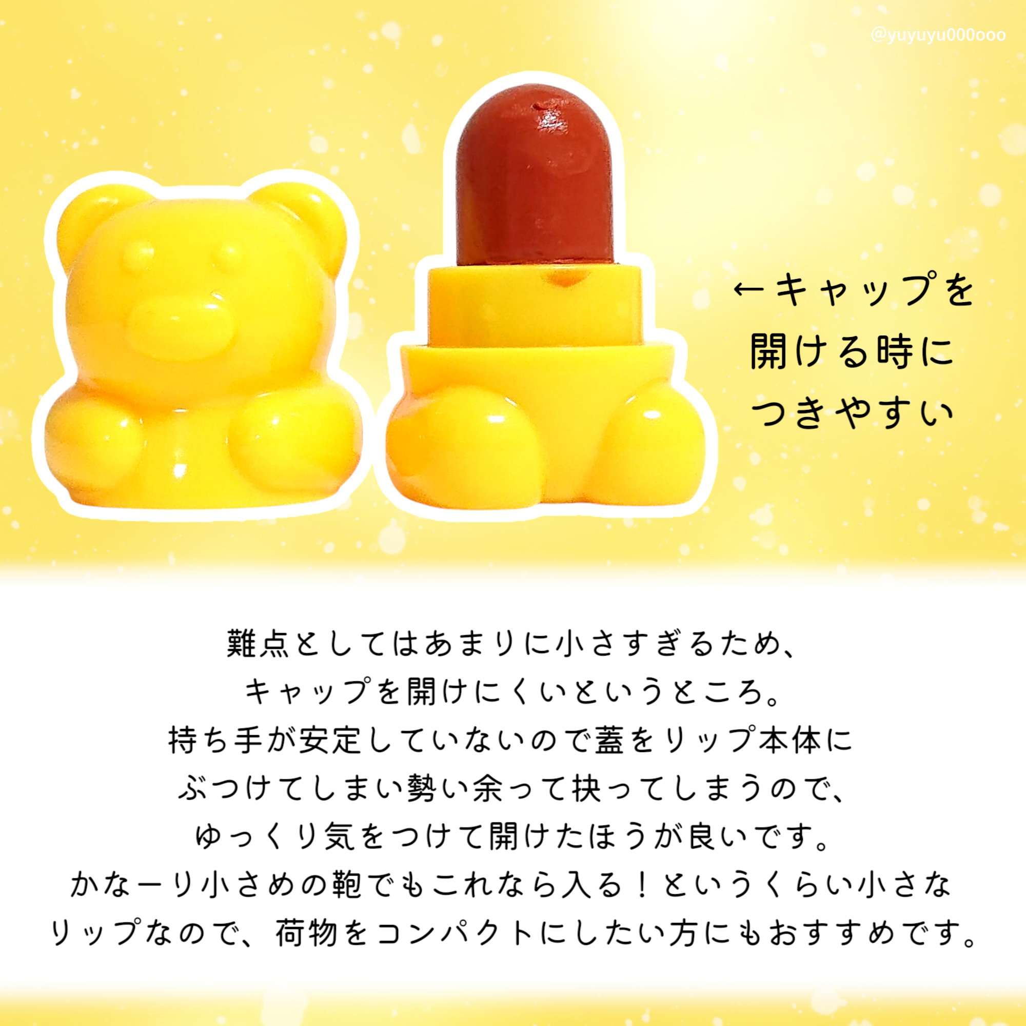 夏のお供に🏖☀️ミニミニちいくまリップ🧸💛CATHYDOLLシャイニーベアリップモイスト可愛すぎる、ミニミニサイズのちいくまリップ🧸なめらかなテクスチャーでするすると、リップバームのような塗り心地。発色も良く、うるツヤ感のあるしっとりとした仕...