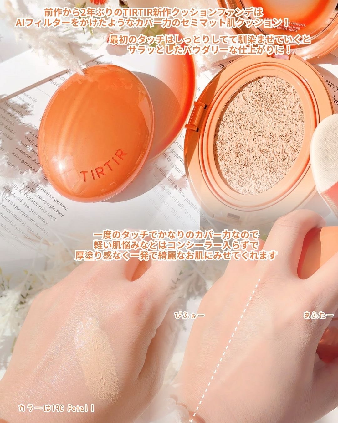 ---------TIRTIRMASKFITAIFILTERCUSHION19CPETAL21CCOOLIVORYAIフィルターをかけたようなパウダリーな仕上がりで、セミマット肌が叶うクッションファンデーション!付け心地はしっとりした水分感があるのに、仕上がりはさらっとパウダーいらずに仕上がる「ギャップテクスチャー」カバー力が高く、ファンデーション・コンシーラー・パウダーの3in1クッションファンデコンパクトがコロンと可愛い、オレンジが映えるデザイン!19Cは私にはちょっと明るい?!と思いましたが、少しずつぽんぽんと押し当ててから、顔全体に広げていくと、かなり違和感なく色が馴染みました!21Cは私の肌色ドンピシャで、肌にのせたらかなり自然な仕上がりになりました。何度もカバーしたいところに厚塗りすると、逆に違和感が生じてしまうので、軽く押し当ててから、馴染ませるのがコツです!蓋裏に量を調整するブレンダーパレットも付いています。コンシーラーやパウダー要らずなので、朝忙しいときにさっとクッション塗りできるのが嬉しい、さすがTIRTIR!!!#PR#TIRTIR#MASKFITAIFILTERCUSHION#AIフィルター肌