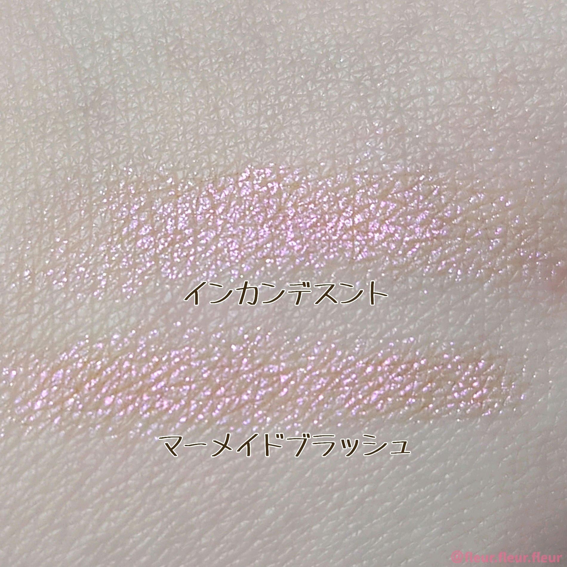 リンメルワンダーラストアイシャドウスティック006マーメイドブラッシュマーメイドブラッシュ魅惑のマーメイドピンクレッド系〜イエロー系偏光ラメアイメイクの仕上げに上まぶた中央や下まぶたにピンポイント使いをしたりブラウンや深いパープル,バーガンディーあたりと組み合わせても使いやすい同時に発売されたマーメイドブラッシュとギャラクティックグリーンの2色が21年ホリデーに発売されたボビイブラウンのシャドウスティックの限定カラー2色と似た組み合わせマーメイドブラッシュはインカンデスントギャラクティックグリーンはスカイワード並べてみると細かく見ないと分からないほどそっくりマーメイドブラッシュはラメが出にくい角度での黄みが少し強いじっくり見てみるとマーメイドブラッシュの方ラメのサイズが大きめラメの多さは重ね塗りすると変わらないですが1度塗りだとインカンデスントが多めマーメイドブラッシュとインカンデスントとの対比も載せておきます#リンメル#リンメルロンドン#ワンダーラストアイシャドウスティック#アイシャドウスティック#マーメイドブラッシュ#こっくりカラーコスメ