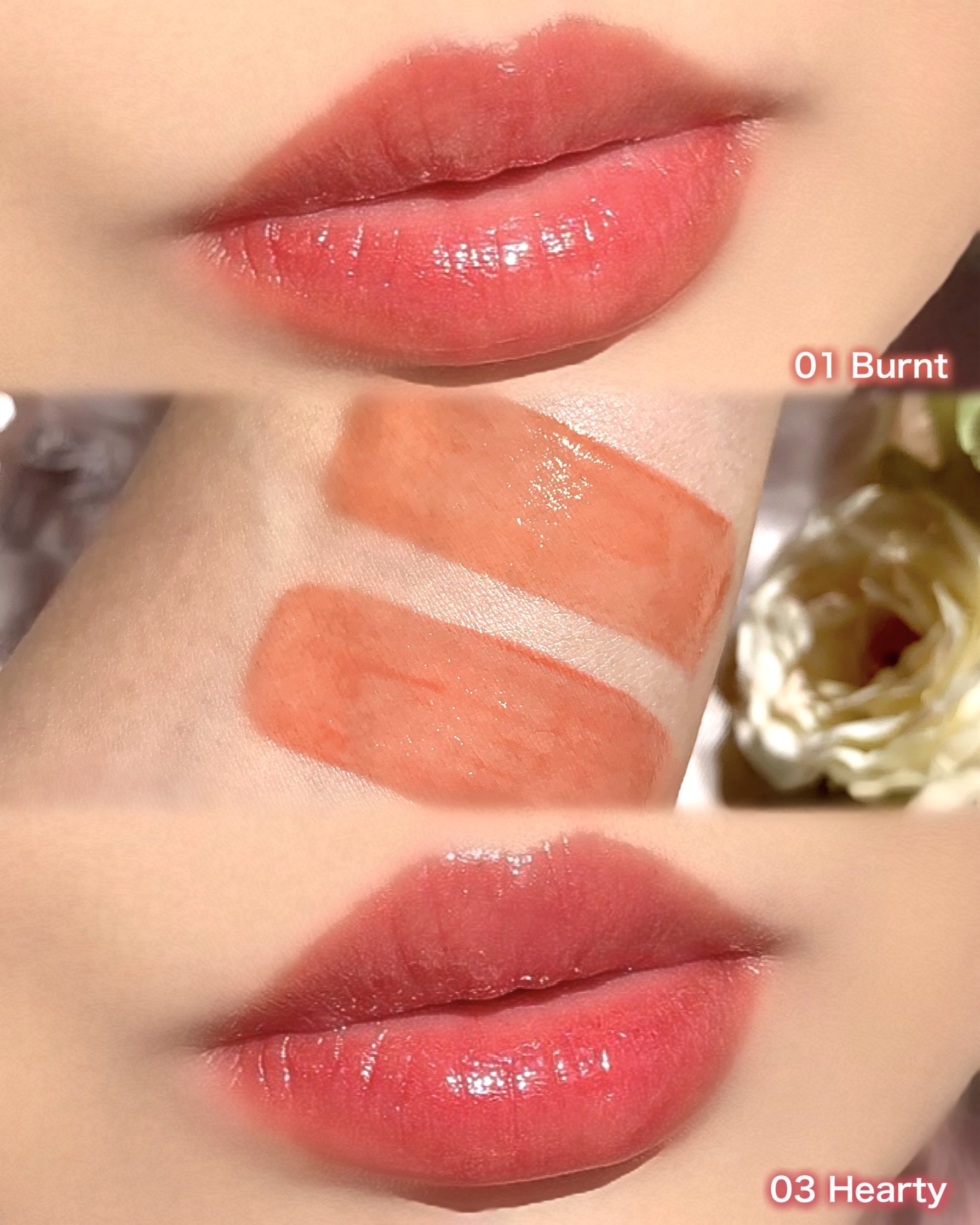 軽いテクスチャで透き通るように輝く水光ティント。 このリップ、色持ちが本当に良い🥺♡ 9色展開だから自分にピッタリな色が見つかるよ◎ イエベ春のわたしは03 ハーティーが可愛くて推しカラー。
