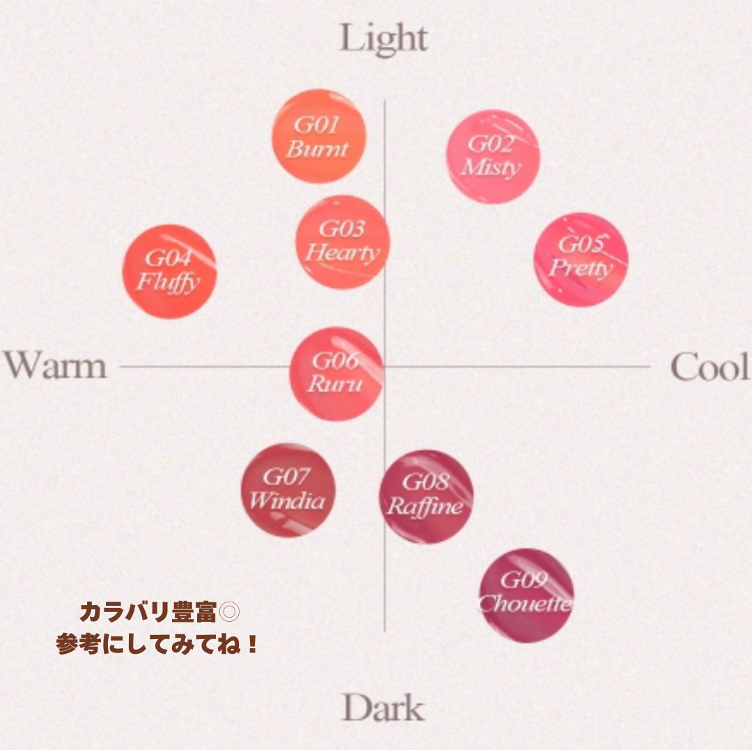 何度重ねても軽い水彩テクスチャ🥺💖 とにかくつやっつや✨✨ ラーメン食べた後も色落ちしてなかった🥺 色残りがすごいリップだよ💖 イエベ春さんにおすすめなのがG03!多幸感がでる✨ 発色もツヤもこれ一本で手に入るからみんなも是非チェックしてみてねーっ🥰