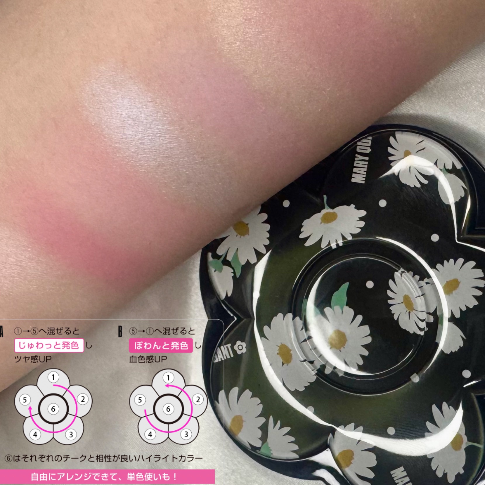 ︎✿MARYQUANTチアリーカラーズフォーチークス01スウィートフラワー03ピュアフラワー腕に試し塗りして見ましたー!!色んな配色で混ぜたり単色でも何パターンも楽しめるチークカラーです。真ん中の丸いところが一応ハイライトのようです。チークカ...