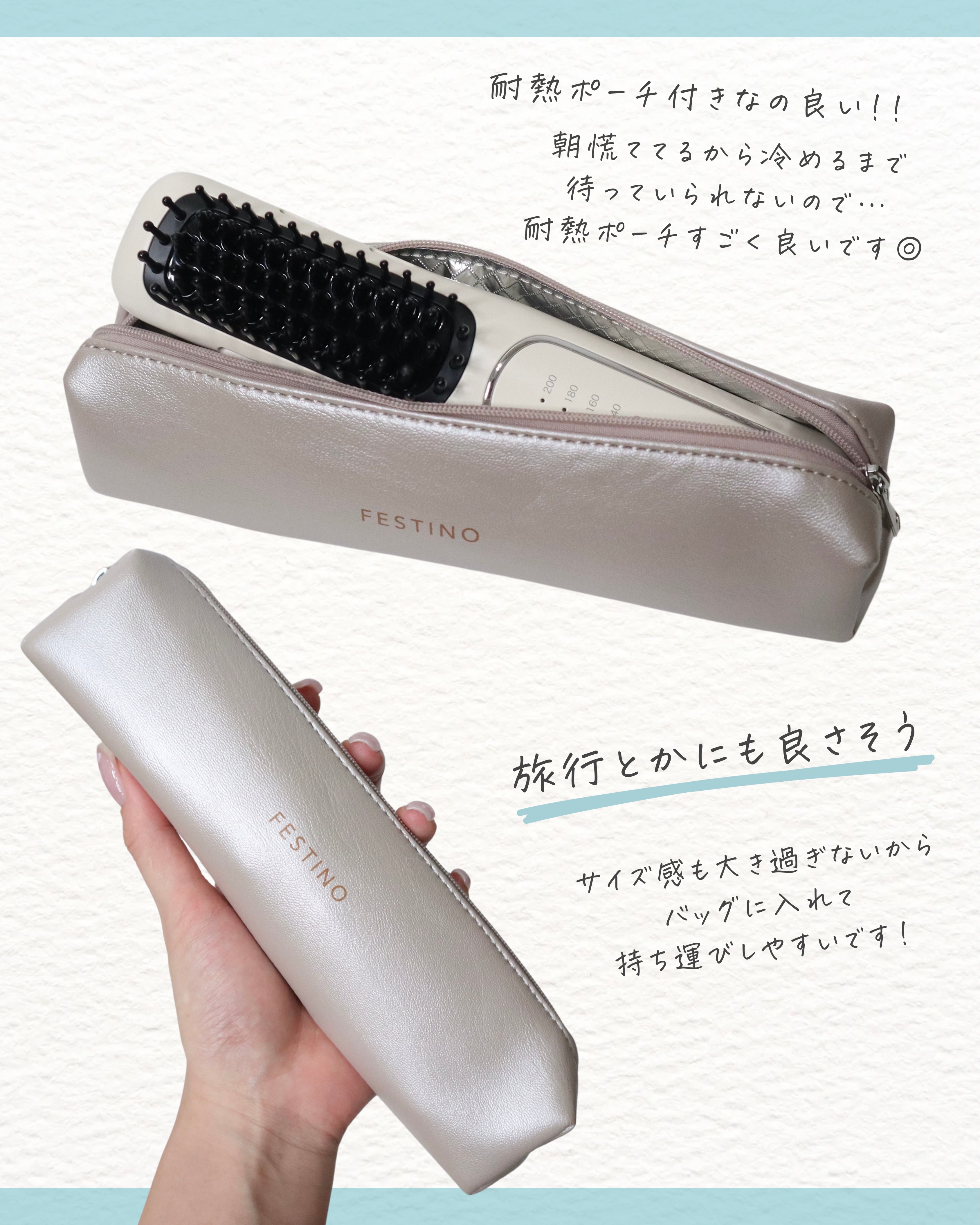 充電式&ブラシタイプで楽&時短//2月に発売したフェスティノの「充電式スタイリングヒーターブラシ」アイロンやコテよりも手軽に使えて、ナチュラルにスタイリングできます◎フェスティノさまからいただきました❁✿✾…………………………✾✿❁︎【製品情報】FESTINOフェスティノ充電式スタイリングヒーターブラシ希望小売価格¥8,800(税込)❁✿✾…………………………✾✿❁︎楽&時短、ナチュラルスタイリング//約70秒で立ち上がるから時間のない朝に🙆🏻♀️ナチュラルなスタイルやサッと準備したい時、外出先で使いたいならすごく便利です✨️ブラシのサイズも持ちやすいし大き過ぎず◎耐熱ポーチ付きなの良い❣️朝慌ててるから冷めるまで待てないので…💦耐熱ポーチすごく良いです!サイズ感も大き過ぎないからバッグに入れて持ち運びしやすいです!旅行にも良さそう🌟#ガチモニター_フェスティノ