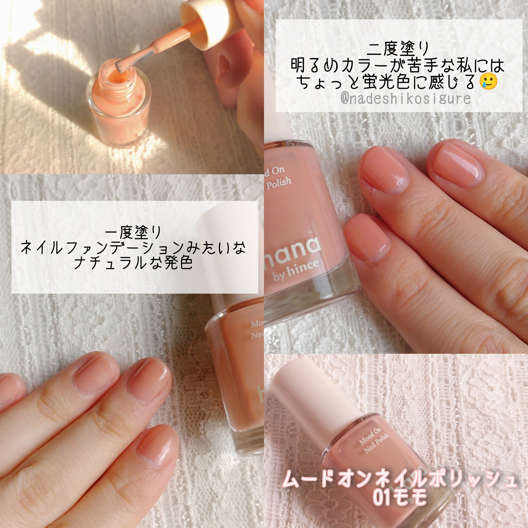 hanabyhinceムードオンネイルポリッシュ01モモファミリーマートで買いました。カラーが可愛いです。塗りやすく、乾くのも早いです。一度塗りはナチュラルに色づきます。やわらかくてデイリーに使えるカラーだと思いました。2〜3回など、仕上がりの好みに合わせて塗れるのもお気に入りです。