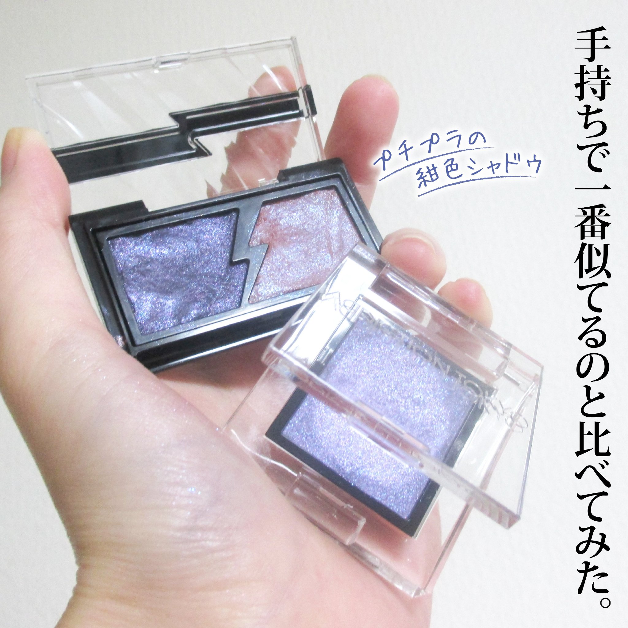 紺色が紺色のまま…だと…!?アディクション ザアイシャドウプリズム【109PRStarryDawn】✼••┈┈••✼••┈┈••✼••┈┈••✼••┈┈••✼2025年夏コスメとして出ている数量限定色。私は紺色のアイシャドウが何故かブラックやグレーに発色する謎体質?で紺色に憧れがありました🥹この109PRはちゃんと紺色らしい発色!しかもあまり強くなくて、スゥ〜…と肌に溶け込むようなナチュラル系。紺色を日常メイクに取り入れやすいとても繊細なアイシャドウです。✼••┈┈••✼••┈┈••✼••┈┈••✼••┈┈••✼色名はStarryDawn、直訳すると「星空の夜明け」。まだ星が見えるのに夜明けの気配がする空の色…😳✨ラメはピンクと青。細かなピンクラメの中に、チラッチラッとやや大粒の青ラメが輝いています。遠くの小さな星と、輝きの強い星みたいな奥行きのある輝き方です。✼••┈┈••✼••┈┈••✼••┈┈••✼••┈┈••✼私の手持ちで最も似ているのがKATEのエレクトリックショックアイズNV-1:ミッドナイトサンダー。プチプラです。これ持ってるから買うのやめようかと思っていたのですが、テスター比べると全く違う仕上がりでした。KATEのは塗ると黒に近い重めのグレーに発色します。かなりディープな雰囲気。ラメはピンクと青なので、組み合わせ的には109PRとほぼ同じなのですが、もっとラメの主張を強めた感じになります。ナチュラルメイクみたいな紺を使ってみたい方は109PR向きかな?クールで重めのラメラメしいメイクをしたい方はエレクトリックショックアイズを見てみると良いかもしれません!#ADDICTION#アディクション#アイシャドウ#ラメ#ブルベ#KATE#ケイト#多色ラメ#デパコス#プチプラ#日本製
