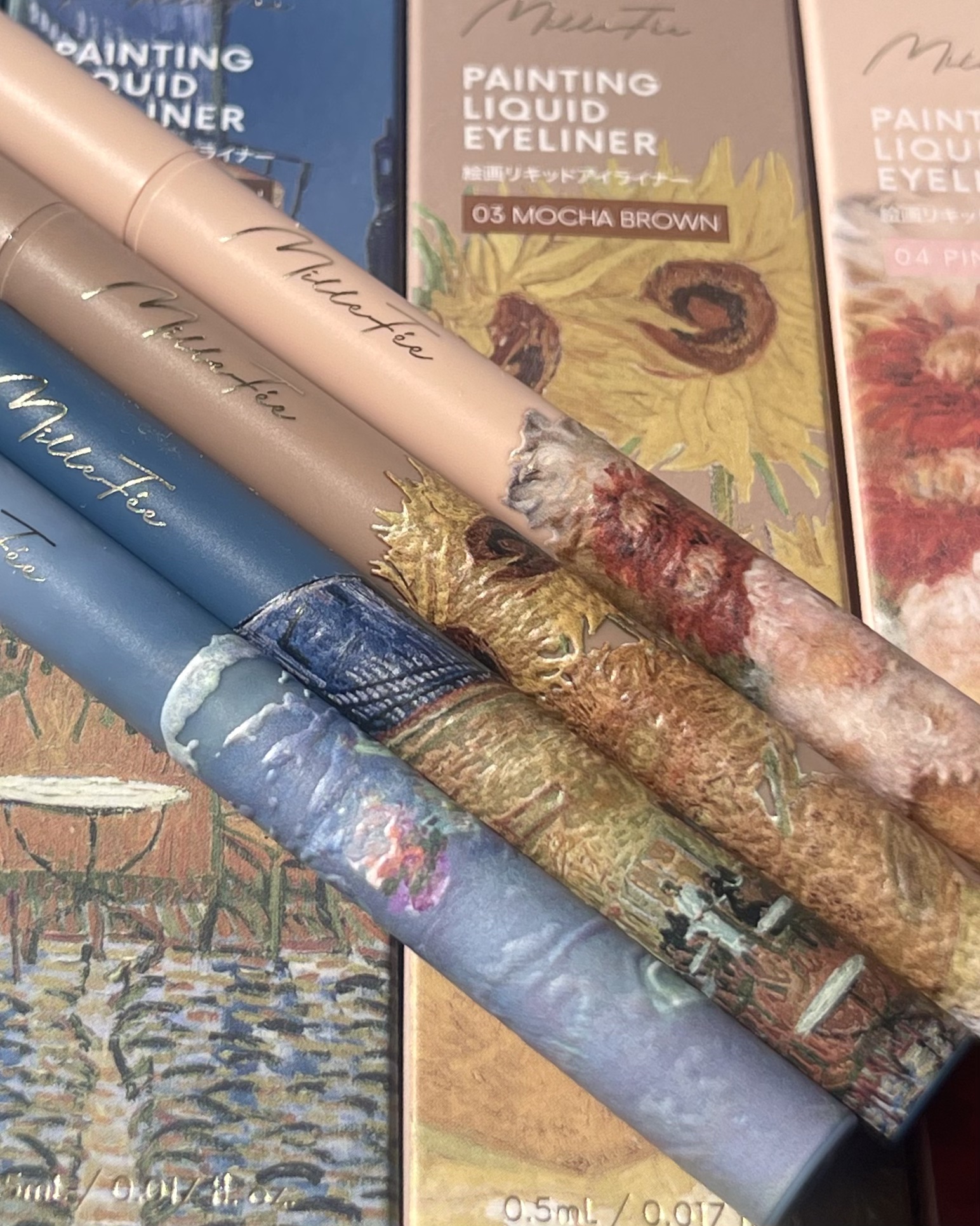 - ・ミルフィー絵画シリーズ待望のリキッドアイライナー 絵画アイシャドウパレットで人気の「睡蓮」「ひまわり」「花束」に絵画シリーズとしては初の、ゴッ ホ「夜のカフェテラス」をラインナップに加えた4色展開。絵画アイシャドウと一緒に使うと更に名画 の世界観に没頭できること間違いなし。 ・極細&短めの筆で狙い通りのラインを 0.01mm*極細×短めの筆がメイク初心者の方でも使いやすくなっています。また、速乾で水・汗脂・こすれに強くにじみにくい高機能のアイライナーをぜひお試しください ・定番カラーに加えて、流行りの涙袋メイクにぴったりなラメカラーも ブラック、ダークブラウン、モカブラウンと馴染みのよい定番カラー3色に加えて、ラメカラーもある 豊富な色展開。ラメカラーは下まぶたにサッとひけばうるうるとかがやく涙袋を演出できます。 【取扱場所】 ・オンライン 2025年2月12日(水)よりMilleFée公式サイト・COSME DELi公式サイト・Qoo10・楽天・Amazon・ZOZOTOWN・SHOPLIST・ Yahoo!ショッピングにて順次販売を開始予定 ・店頭(いずれも一部店舗を除く) 2025年2月下旬 全国のロフトおよびロフトネットストアにて順次先行販売を開始予定 2025年3月下旬 全国のバラエティストアにて順次販売を開始予定