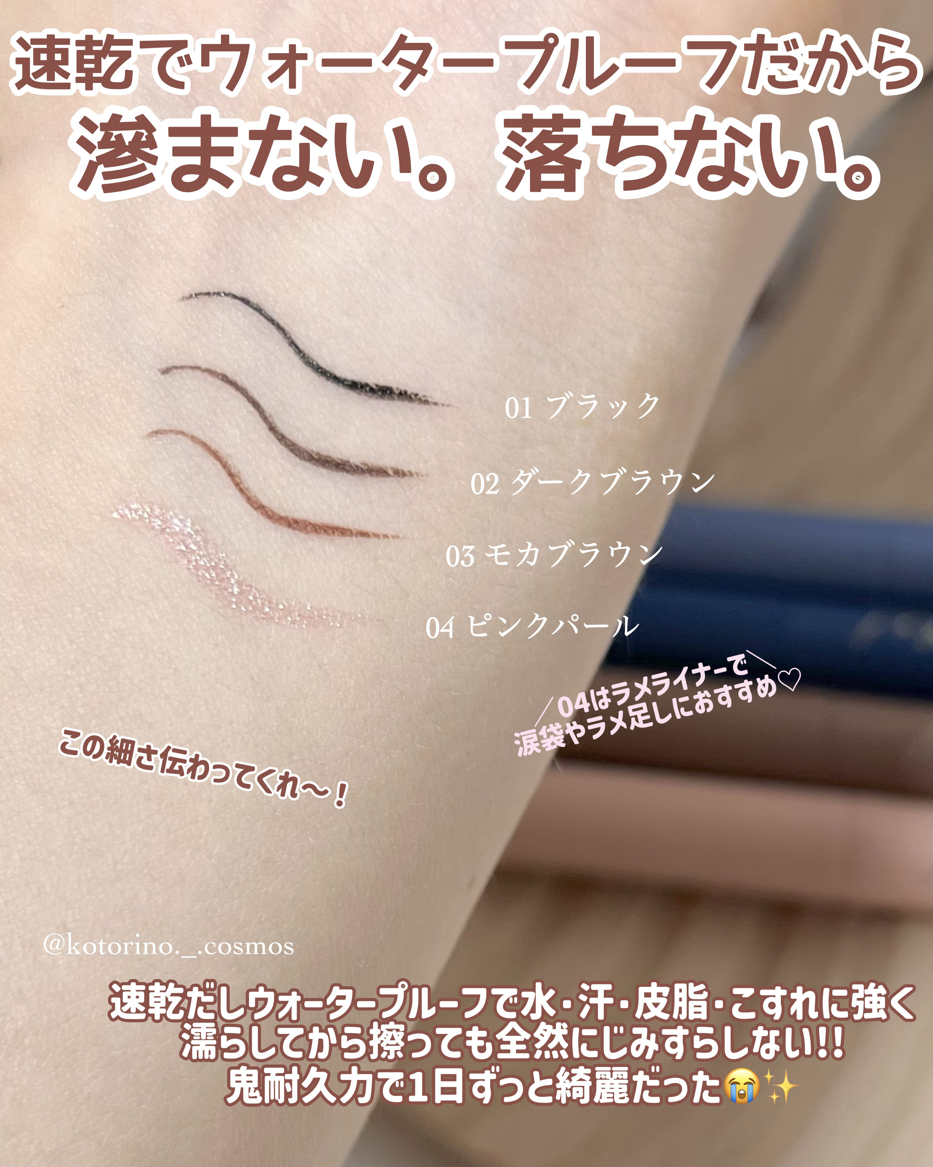 \極細0.01mmの絵画ライナー🎨優秀すぎるライナーだった…!/Millefée//絵画リキッドアイライナー01ブラック02ダークブラウン03モカブラウン04ピンクパール各¥1,430(税込)・・・・・・・・・・・・・・・極細0.01mmの絵画ライナー🎨優秀すぎるライナーだった…!ミルフィーの話題になった絵画シリーズのアイライナー気になってた〜♡パケがお洒落可愛いだけじゃなく、機能性バッチリすぎてリピしたい💪🏻アイライナーとしてのカラーは3色と、ラメライナー1色。とにかく筆先がほっっっそい!!!なのにめちゃくちゃ描きやすくて、アイラインも下まつげまで自由自在🎶繊細に描けるからほくろも描けちゃう🙆🏻♀️ラメライナーは涙袋にぴったり💕血色感ピンクと細かいキラキラでラメ足しにもおすすめ❣️水に濡らしてから擦っても少しも滲まないし、腕に1日描いたままにしてみたのは夜までビクともしなかった!!もちろん、目元に描いたアイラインも汗かいても落ちなくて超優秀🥰私は02ダークブラウンがお気に入り!ぜひチェックしてみてね🫶🏻・・・・・・・・・・・・・・・#Millefee#ミルフィー#アイライナー#絵画#プチプラ美容部#コスメ#メイク#化粧品#メイク好きな人と繋がりたい#耐久コスメ選手件