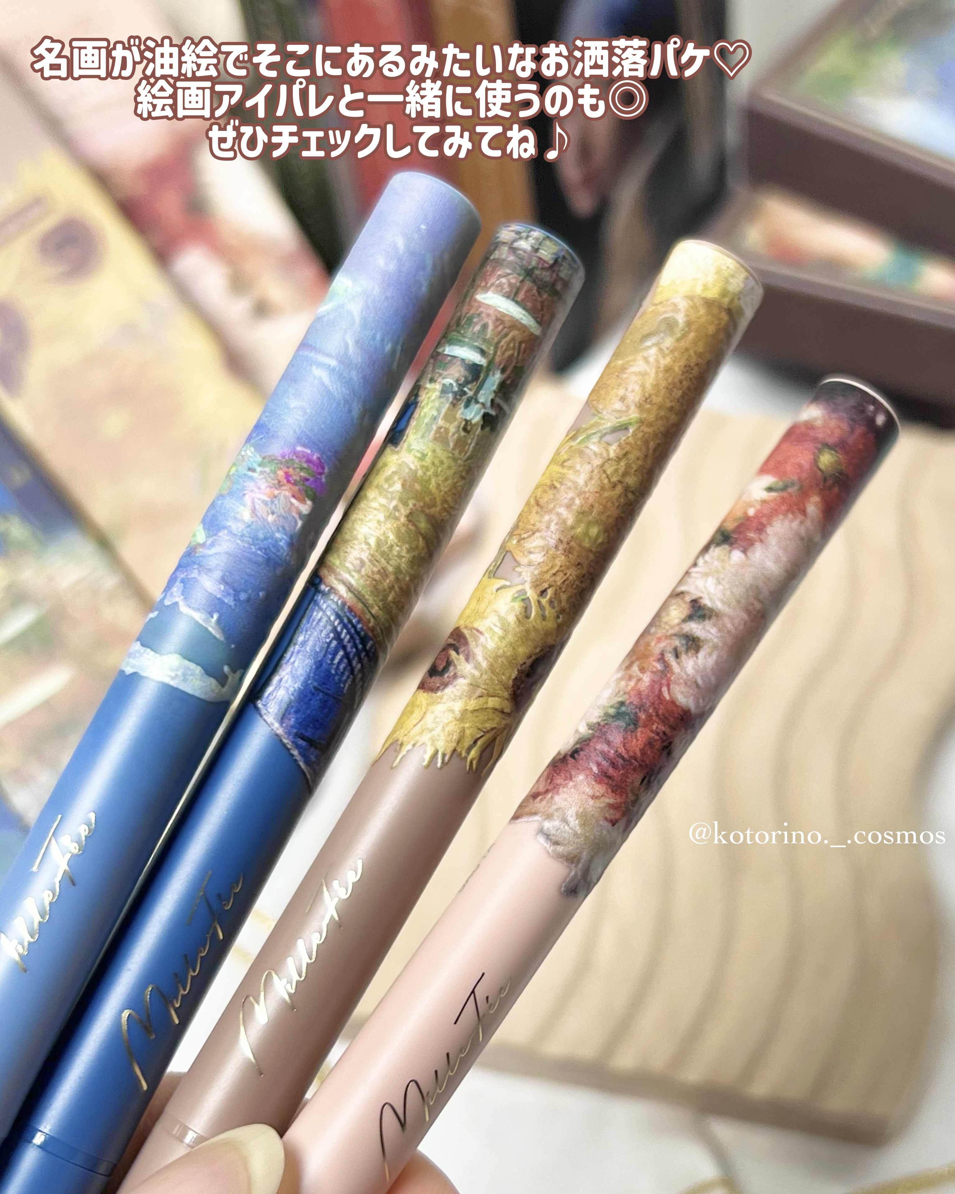 本体にね、油絵の絵の具のように凹凸のある絵画が描かれたデザインが大変素敵で🫶🏻 筆先端0.01mmの極細ラインでアイライン苦手な方におすすめ 涙袋にさっと入れるだけでうるみやばみなぷっくり涙袋が作れるしめっちゃ滲みにくくてメイクもちいいのさいこ〜!