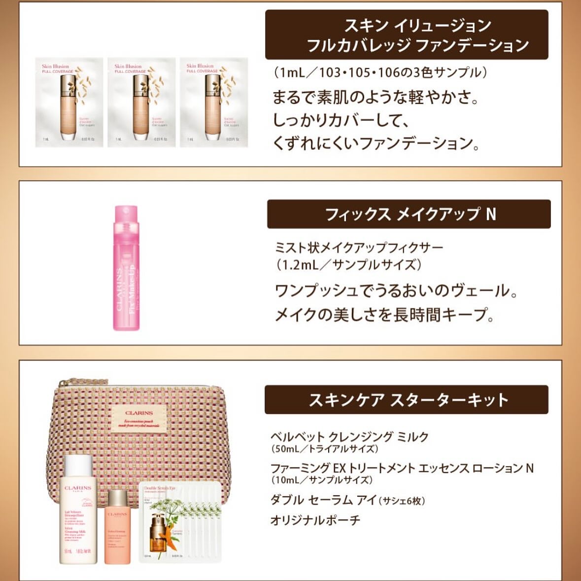 CLARINSスキンイリュージョンフルカバレッジファンデーション✨━━━━━今回3色のサンプルを頂いたのでカラーの比較、私の腕にしてみました!実際、顔に使用したのは105のカラーです。最初は、少し白かったかな?って思ったけど馴染むと違和感無かったです。塗布した時から、しっとりと美容液を使ってる様な感覚で、窮屈感無くメイクしてるのを忘れるくらい軽い使用感❣️フィックスと合わせると仕上り大満足💯最近、寝起きに目周りの乾燥が特に気になってたんだけど、ダブルセーラムアイで、しっとりぷにぷにな目元に‼️クレンジングミルクも、しっかりメイク落とせるよ。オリジナルポーチも可愛いの♡今回お試しさせて頂いた内容は↓↓↓です。◾︎スキンイリュージョンフルカバレッジファンデーション(1mL/103・105・106の3色サンプル)◾︎フィックスメイクアップN(1.2mL/ミスト状メイクアップフィクサー/サンプルサイズ)さらに、メイクのノリを底上げするスキンケアスターターキット‼️◾︎ベルベットクレンジングミルク(50mL/トライアルサイズ)◾︎ファーミングEXトリートメントエッセンスローションN(10mL/サンプルサイズ)◾︎ダブルセーラムアイ(サシェ6枚)◾︎オリジナルポーチ私の物欲センサーが反応しちゃうセットでした·͜·ᰔᩚ