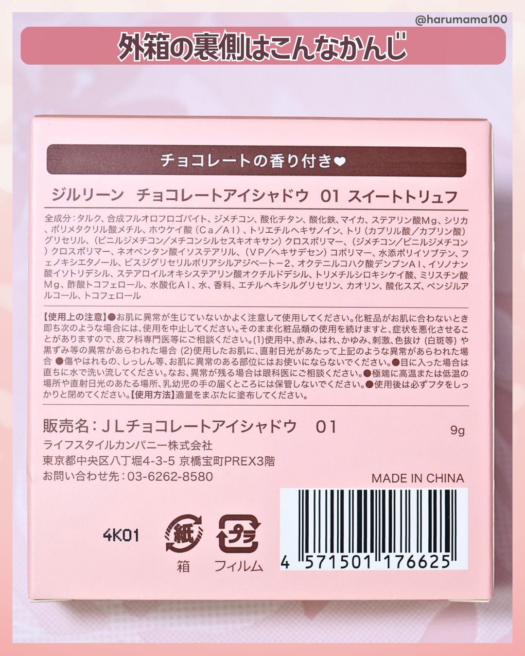 【甘くソフトなチョコ色♡香るアイパレ】───────────────jillleen.ジルリーンチョコレートアイシャドウ01スイートトリュフ参考価格1,760円(税込)───────────────とろけるチョコをモチーフにしたスイーツコスメが可愛いっ🍫柔らかな色合いの9色がセットされていて質感も色々楽しめる♡マット・シマー・グリッターの構成なんだけどどれもソフトな使い心地で統一感があるよ。もはや定番となりつつあるモカムースメイクやラテメイクにも取り入れやすい。全体的に淡い発色だからやさしめの仕上がりになったよ〜💕個人的にはもうちょい濃くてもいいかなーって思うけど最近はこれぐらい淡いのが流行りだよね🤔チョコの香りはほんのりだからクンクンするとわかるレベルだった!カワイイ〜ッ!───────────────#コスメ購入品#내돈내산#jillleen.#ジルリーン#中国コスメ#アイメイク#アイシャドウ#アイパレ#eyeshadow#モカムースメイク#ショコラメイク#チョコメイク#メガ割#Qoo10#香りでときめく冬支度