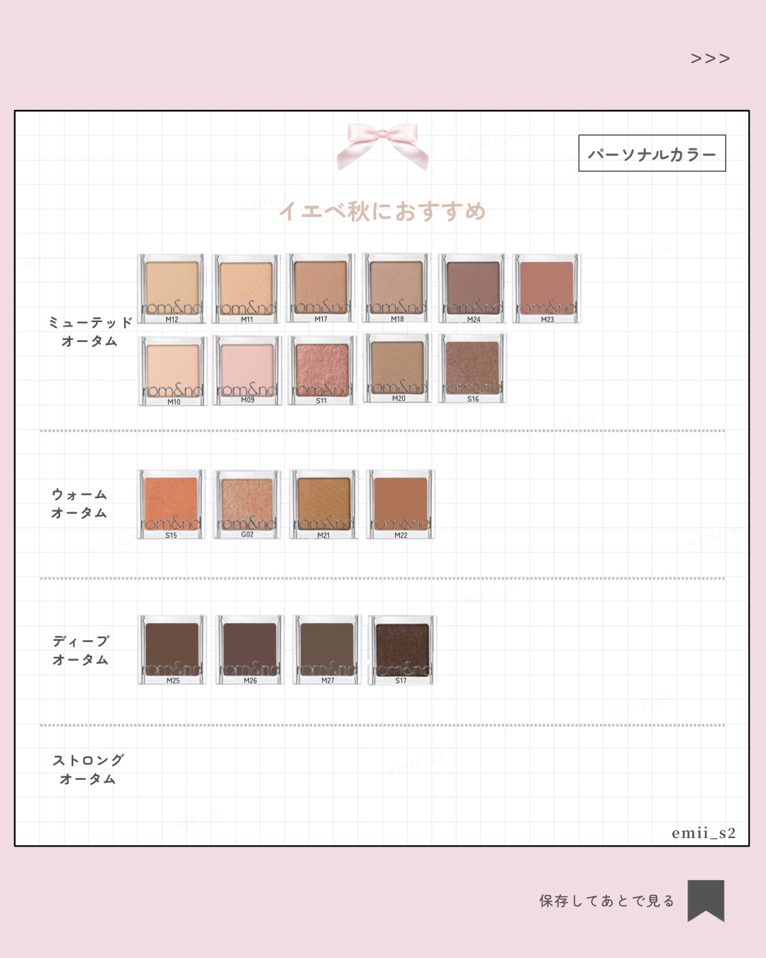 【2025年最新版•2ndあり】ロムアンド新作単色アイシャドウを全色パーソナルカラー分類🎨保存推奨です🎀┈┈┈┈┈┈┈┈┈┈┈┈┈┈┈現時点で全49色/新色や限定色が出た時は、この投稿に追加します!🗒️参考になれば嬉しいです♡┈┈┈┈┈┈┈┈┈┈┈┈┈┈┈rom&ndスライドインシングル¥770プチプラとは思えない粉質と豪華なカラバリ🎨お気に入りを1つだけを選ぶのも◎自分だけのオリジナルパレットを作るのも◎アイシャドウだけじゃなく、マットハイライトやチークにも使えてメイクの幅が広がります♡┈┈┈┈┈┈┈┈┈┈┈┈┈┈┈M01WARMVOLUMERM02COOLVOLUMERM03YOGURTCREAMM04JUICYMANGOM05MELONDEWM06SODAPOPM07SPRINGLAVENDERM08PALEPEONYM09BEHAZYM10TOFFEELATTEM11CUSTARDM12MARGARETM13GRAPECREAMM14TOESHOESM15NOTHINGPEACHM16FIGWHIPPINGM17PONYM18PLAINMOCHAM19MAUVEDOUGHM20DAILYBUCKWHEATM21WARMCARAMELM22MIDMARRONM23REDBEANSM24DUSTM25CHUBBYCHOCOM26BLENDINGCOCOM27COLDBREWS01GLAZES02RICHLEMONS03BLUEVEILS04BARETAROS05BUBBLYS06SORBETWHIPS07PORCELAINS08PINKSHAS09SALTYVANILLAS10JANMBONGPINKS11MASHEDGRAPEFRUITS12CAPRIVIOLETS13LAZYMAGENTAS14BADDIES15GINGERS16EARLGREYS17FUDGEG01SNOWYG02BUTTERRINGG03BUNNYCHATG04PURPLELITG05NUMETEORパーソナルカラーは個人の判断ですご参考までに🎨公式画像は使用許可をいただいています。┈┈┈┈┈┈┈┈┈┈┈┈┈┈┈♡+🖇️+💬いつもありがとうございます♪┈┈┈┈┈┈┈┈┈┈┈┈┈┈┈#イエベ#ブルベ イエベ春 イエベ秋 ブルベ夏 ブルベ冬 ニュートラル ラメ グリッター マット プチプラ 韓国コスメ 新作コスメ 単色アイシャドウ #初買いコスメレビュー