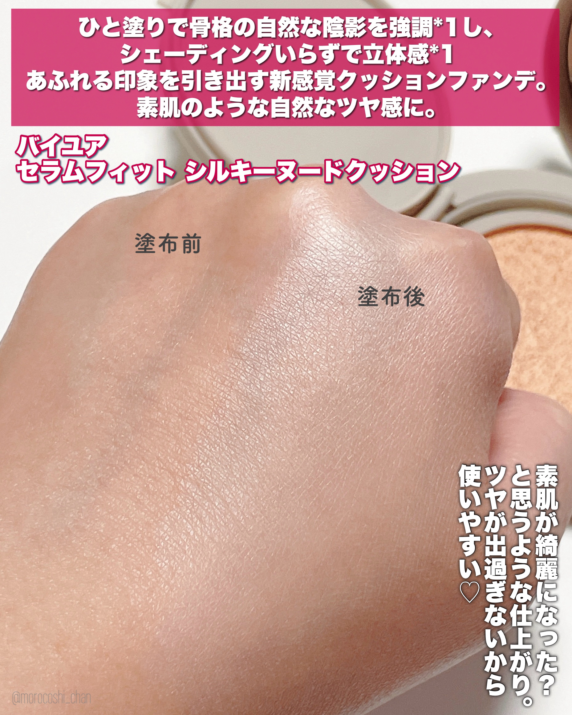 人気の韓国コスメByURから骨格レベルできれいに見える小顔クッション 「セラムフィット シルキーヌードクッション」が新登場❣️ スキンケア成分62%&ニキビの原因になりにくい処方で肌がゆらぎやすい花粉シーズンにも💛 みずみずしく軽い美容液のような質感でハイライトを入れたい部分には上質なツヤを、影を入れたい部分はツヤを抑えてほんのりセミツヤ仕上げに。