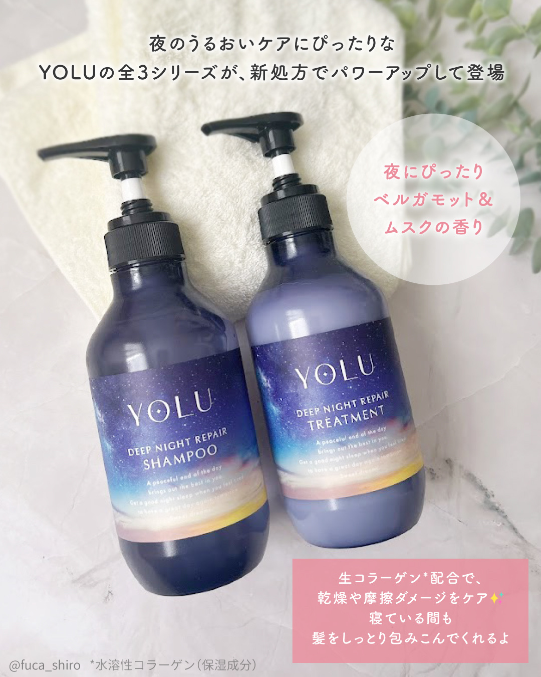 YOLUディープナイトリペアシャンプー/トリートメント【ベルガモット&ムスクの香り】440ml/440g各1,540円(税込)(※Miu調べ)YOLUの全3シリーズのシャンプートリートメントが、より濃密な夜間美容を提供する新処方でリニューアル...