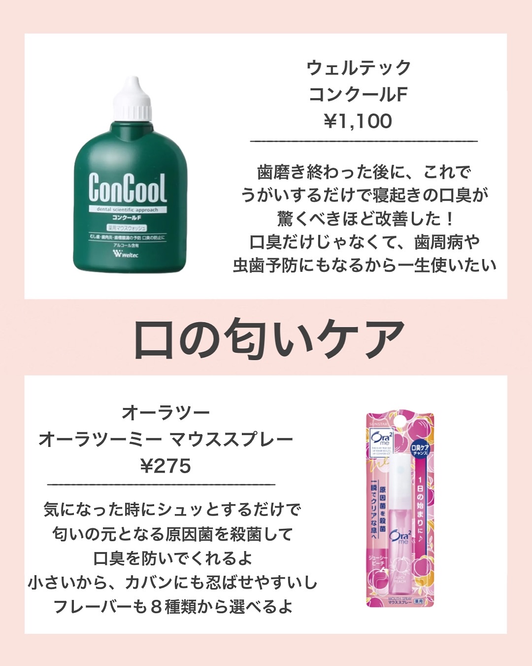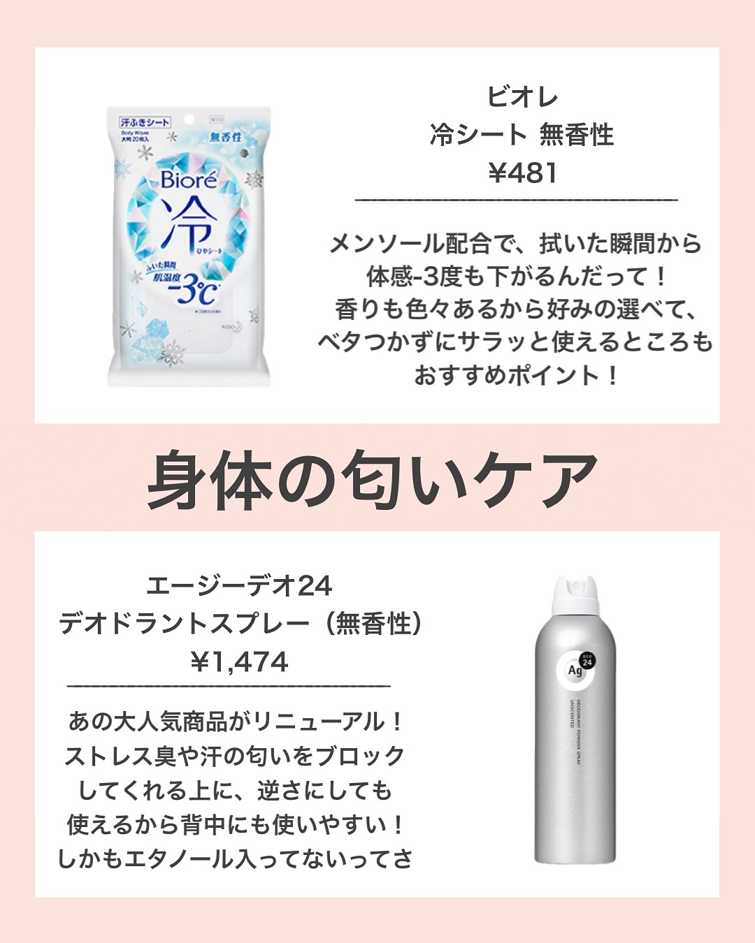 その他の投稿はこちらから→@haru_skincare_beauty本日は《匂いケアアイテム》のご紹介です🫶🏻ーーーー⭐️脇の匂いケア🌿デオナチュレ薬用ソフトストーンW¥990これリピしない人いる?てくらいハマっちゃう殿堂入りアイテム!外出前に脇に塗り塗りするだけで驚くほど脇の匂いが改善されるしスティックタイプだから使いやすさも◎🌿デオナチュレ薬用さらさらクリーム¥1,078デオドラントのクリームで1番人気でシリーズ最大量の「焼ミョウバン」配合上のスティックじゃ匂いが不安な人はこっちの方を使ってみてクリームなのにサラサラになるよ⭐️頭皮匂いケア🌿エイトザラタソウォーターレスドライシャンプー¥1,320髪が脂っぽくなりやすい人や外出先でもケアしたい人はコレ水不要で汗の匂いやベタつきを瞬時にリフレッシュしてくれるよひんやりするから気持ちもいい🌿ラッシュ現実頭皮¥2,400一時期バズった話題のアイテム!お風呂で使うものだけど頭皮だけじゃなくて髪もトュルトュルにかなりスーッと感するから冬は注意だけど夏は無くなる前にゲットして⭐️足の匂いケア🌿デオナチュレ薬用足指さらさらクリーム ¥990夏のデートはこれなしじゃ不安足は一日にコップ一杯分の汗をかくから蒸れて匂いやすいらしい!白残りもしにくいしベタつかないクリームだから試す価値あり🌿グランズレメディフットパウダーオリジナル¥922お仕事用の靴の匂い消しとして使ってから抜け出せなくなった靴の匂い臭すぎる!!て人は夏でも冬でもとりあえずこの粉入れといてしかも粉全然無くならんコスパ◎⭐️口臭ケア🌿ウェルテックコンクールF¥1,100歯磨き終わった後に、これでうがいするだけで寝起きの口臭が驚くべきほど改善した!口臭だけじゃなくて、歯周病や虫歯予防にもなるから一生使いたい🌿オーラツーオーラツーミーマウススプレー¥275気になった時にシュッとするだけで匂いの元となる原因菌を殺菌して口臭を防いでくれるよ小さいから、カバンにも忍ばせやすいしフレーバーも8種類から選べるよ⭐️体臭ケア🌿ビオレ冷シート無香性¥481メンソール配合で、拭いた瞬間から体感-3度も下がるんだって!香りも色々あるから好みの選べて、ベタつかずにサラッと使えるところもおすすめポイント!🌿エージーデオ24デオドラントスプレー(無香性)¥1,474あの大人気商品がリニューアル!ストレス臭や汗の匂いをブロックしてくれる上に、逆さにしても使えるから背中にも使いやすい!しかもエタノール入ってないってさ※個人の感想ですーーーー最後までご覧いただきありがとうございます!他に比較見てみたい!というアイテムがあればコメントで教えてください🥰ーー***一***ーー***主に失敗しないコスメ選びのための内容を中心に発信しています🌼比較して欲しいアイテムがあれば、コメントで教えてください❣️他の投稿→@haru_skincare_beauty気軽に《いいね・コメント・フォロー》して頂けると嬉しいですーー***一***ーー***#PR#デオナチュレ#LIPSプレゼント#エイトザラタソ#ラッシュ#ビオレ#オーラツー#デオドラント#グランズレメディ#匂いケア#足の匂い#香りアイテム#無香料#夏のエチケット
