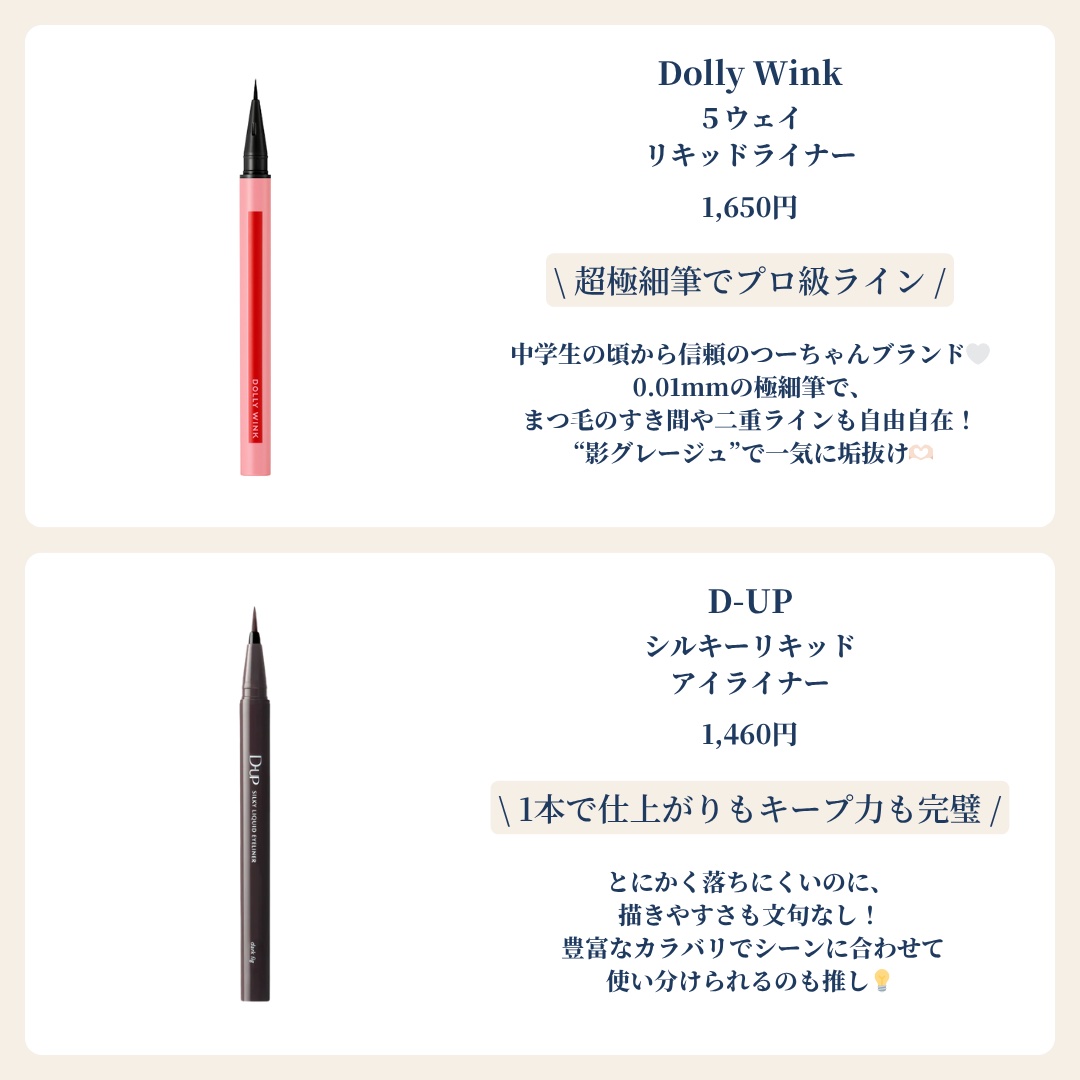 🦋アイライン難民卒業!目元仕上げの主役🪄神アイライナー8選👁✨にじむ・ヨレる・引きにくい…そんな悩みを解決💭描き心地も仕上がりも妥協しない、“本気で信頼できるアイライナー”を厳選しました🤍🧴LoveLiner|リキッドアイライナー(1,760円)泣いても落ちないのに、描きやすさ最強😭✨/どんなアイライナーを試しても、結局ここに戻る!にじみにくくて涙にも強いのに、スルスル描けるのが神🪄限定パケも多くて気分上がるし、リフィル式でコスパも◎🧴ヒロインメイク|プライムリキッドアイライナーリッチキープ(1,320円)水・汗・涙どれも怖くない👑/マスカラだけじゃなくアイライナーも名品💐しっかり密着してヨレないのに、お湯でスルンと落ちる優秀さ🌿朝から夜まで美ラインキープできる“ヒロイン級”💭🧴CANMAKE|クリーミータッチライナー(715円)コスパ最強の神ジェルライナー🙌🏻/プチプラなのに描き心地なめらかで発色も◎芯が柔らかくスルッと引けるのに、にじみにくいのが好き💞ストック切らすと不安になるほどのリピ確アイテム😂🧴BIDOL|イージーeyeライナー(1,210円)粘膜ラインでナチュデカ目仕込み👀💗/“101おねだりピンク”は血色感が絶妙🩰さりげなく盛れるから、インラインや涙袋にもぴったり◎ジェルのしっとり質感で、抜け感ある目元に🫧🧴DollyWink|5ウェイリキッドライナー(1,650円)超極細筆でプロ級ライン✏️✨/0.01mmの極細筆でまつ毛のすき間も自由自在!“影グレージュ”で涙袋ラインを描くと一気に垢抜け🪶学生時代から信頼してるブランドで、今も現役推し🤍🧴D-UP|シルキーリキッドアイライナー(1,460円)1本で仕上がりもキープ力も完璧🍃/とにかく落ちにくいのに、描きやすさも優秀👏“グレーカシミア”のやわらか発色が可愛くて推し🩶カラバリ豊富でシーン別に使い分けできるのも嬉しい💡🧴dejavu|ラスティンファイン極細クリームペンシル(1,320円)スルスル描けるのにヨレない🎯/芯がしなやかでスッとラインが決まる🪞ジェルが苦手な人にもおすすめできる描きやすさ◎目尻までストレスなく引けてデイリーに大活躍💐🧴excel|ニュアンスフルペンシルライナー(1,320円)トレンドカラーで垢抜け目元🪄/くすみ・ニュアンスカラーが豊富でどれも洒落感💭なめらかに描けて自然な陰影がプラスされる✨オフィスメイクにも休日メイクにも馴染む万能ペンシル🤍まとめ💡“盛れるアイライン”のカギは描きやすさ×キープ力🌿自分の目元や仕上がりの好みに合わせて、運命の1本を見つけてね👀💫💬「これ気になってた!」「使ったことある!」などぜひコメントで教えてね💬📌役に立ったら、いいね&保存していつでも見返せるように💡👭フォローして一緒に楽ちん美容を楽しもう!#アイライナー#リキッドアイライナー#ジェルライナー#ペンシルアイライナー#涙袋メイク#垢抜けメイク#ナチュラルメイク#デカ目メイク#目元メイク#落ちにくいアイライナー#にじまないアイライナー#プチプラコスメ#韓国コスメ#デパコス#アラサーメイク#メイク好きさんと繋がりたい#コスメレビュー#時短メイク#美容オタク#正直レビュー