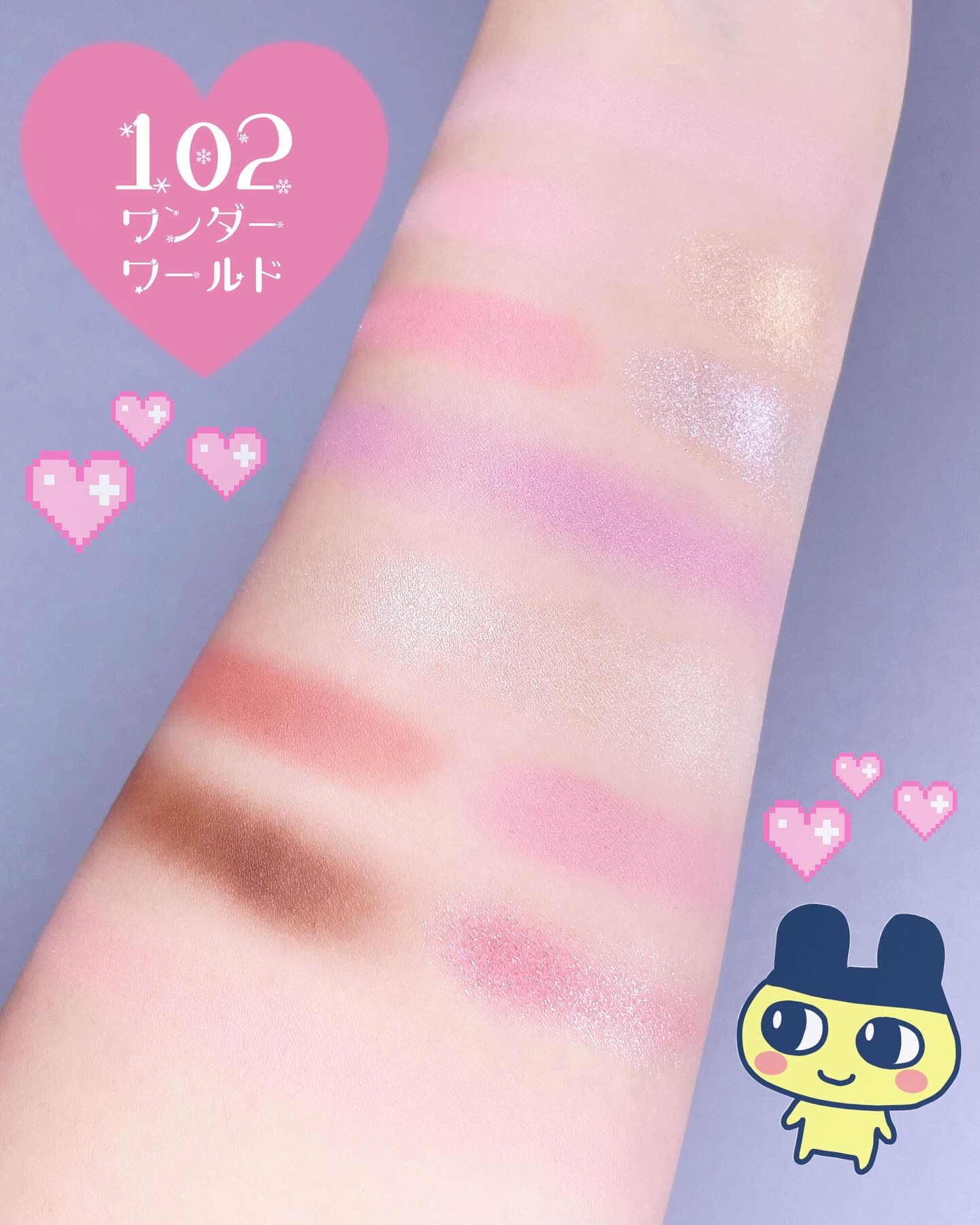 キャラクターたちと一緒に楽しむ 多彩なワンダーワールドをイメージしたといいます 肌なじみがいいピンクを中心にラメ感を楽しめるアクセントカラーも取り入れたカラバリに個性あふれる 誰でも簡単に自分だけのメイクを表現できますよ
