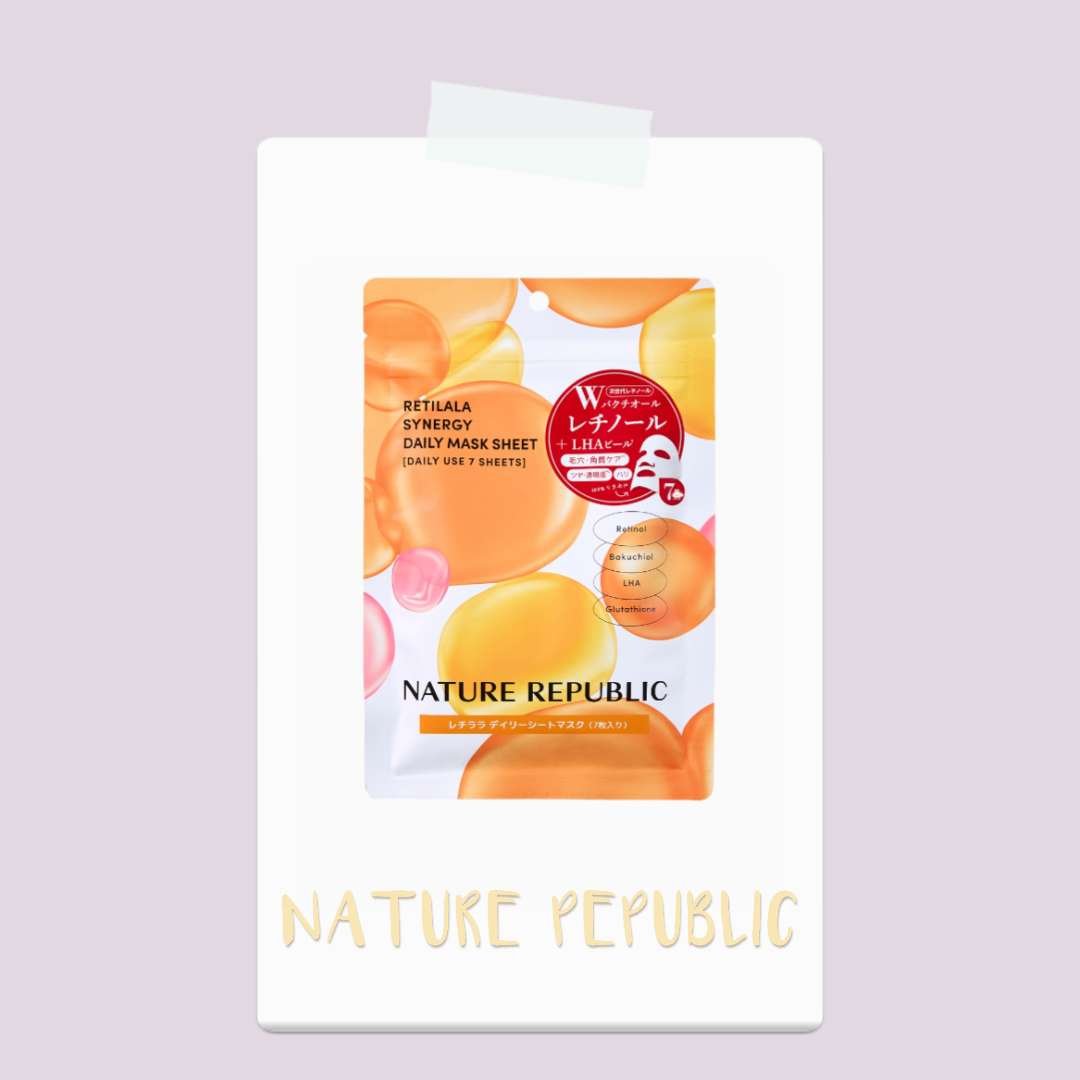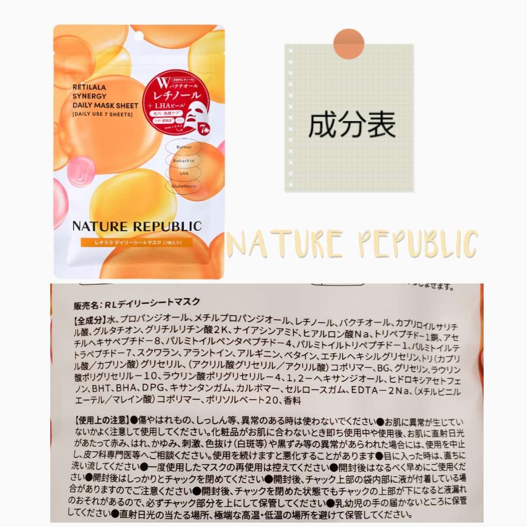 ✔︎レチララデイリーシートマスクNATURE REPUBLICより新しいシートマスクが登場🧡レチノールと次世代レチノールと呼ばれるバクチオール、第4世代ピーリングと言われるLHAを配合したシートマスク。拭き取りと保湿ケアが1枚で完結する新...