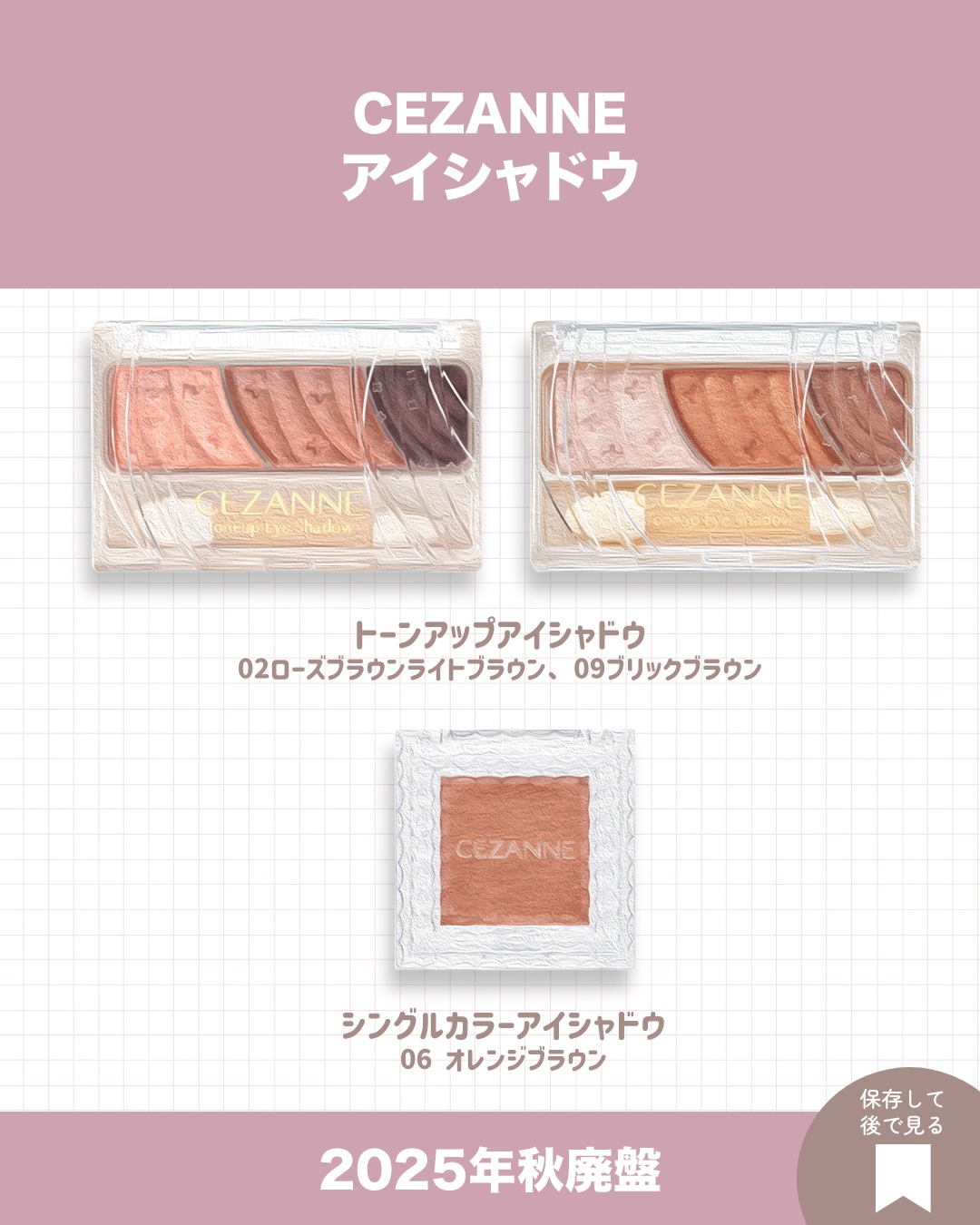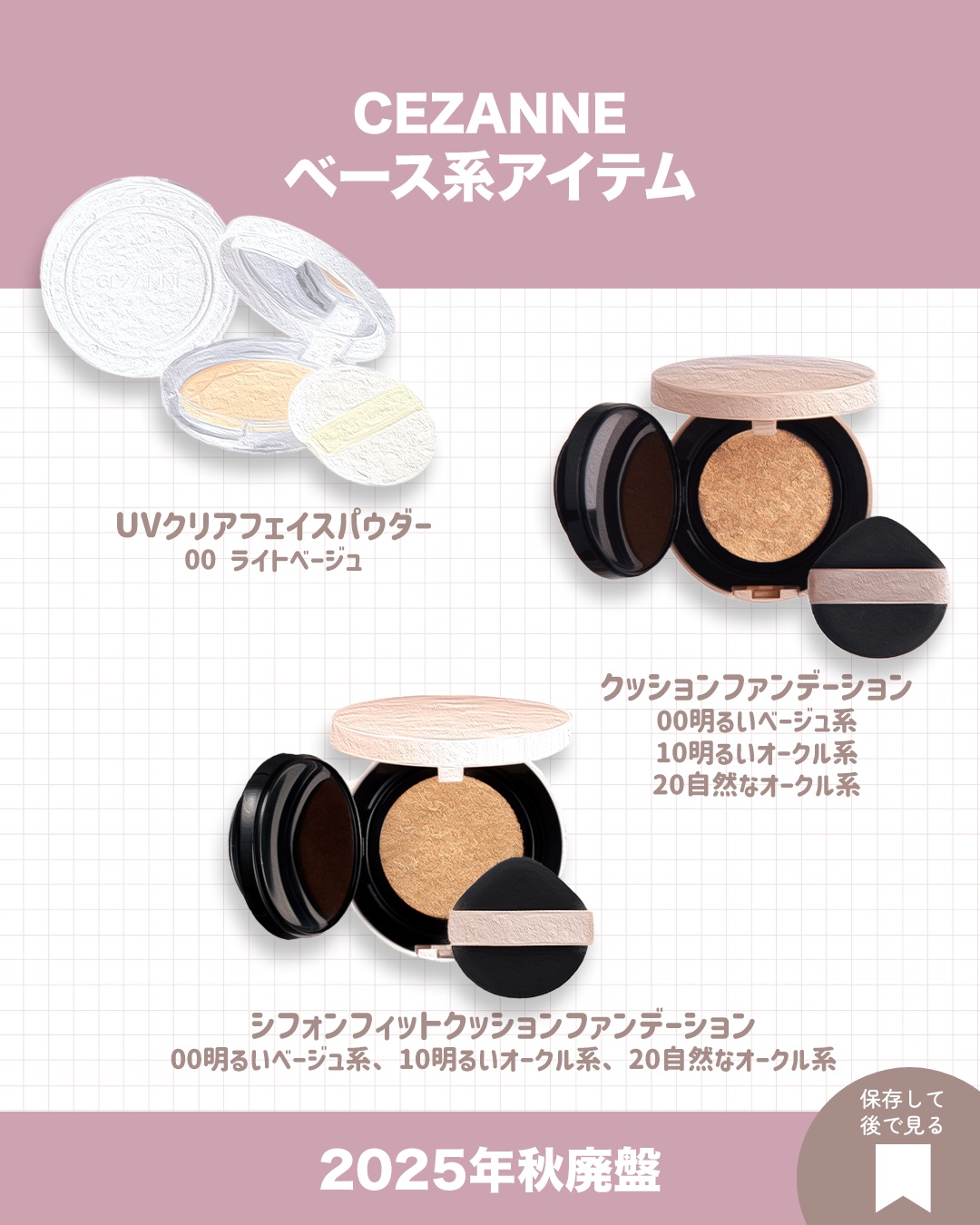 セザンヌの2025年秋の廃盤アイテムまとめ!セザンヌ【リップ・チーク】 ☑︎ウォータリーティントリップ 04キャメルオレンジ ☑︎ラスティンググロスリップ BE1ベージュ系 PK2ピンク系 RD1レッド系 ☑︎パールグロウチーク P2ベージュコーラル P3シナモンオレンジ☑︎ミックスカラーチークN 20ブラウンシェーディング 【アイブロウ】 ☑︎細芯アイブロウ ライトブラウン ブラウン ☑︎極細アイブロウマスカラ C3シナモンブラウン ☑︎ノーズ&アイブロウパウダー 05コーラルブラウン 06ピンクブラウン 【アイシャドウ】 ☑︎トーンアップアイシャドウ 02ローズブラウン 09ブリックブラウン ☑︎シングルカラーアイシャドウ 06オレンジブラウン 【ベース】 ☑︎UVクリアフェイスパウダー 00ライトベージュ ☑︎UVクリアフェイスパウダー〈詰替〉 00ライトベージュ☑︎クッションファンデーション 00明るいベージュ系 10明るいオークル系 20自然なオークル系 ☑︎クッションファンデーション〈詰替〉 00明るいベージュ系 10明るいオークル系 20自然なオークル系 ☑︎シフォンフィットクッションファンデーション 00明るいベージュ系 10明るいオークル系 20自然なオークル系 ☑︎シフォンフィットクッションファンデーション〈詰替〉 00明るいベージュ系 10明るいオークル系 20自然なオークル系たくさんのアイテムが廃盤になるようです…!いつでも見返せるように保存しておいてください!よかったらお買い物の参考にしてください♡インスタもよろしくお願いします!Instagram▷▷ @pomi_cosme_#廃盤 #廃盤コスメ #廃盤コスメ情報 #CEZANNE #プチプラ #アイブロウ #アイシャドウ #ラメ #リップ #ハイライト #シャドウ #パウダー #フェイスパウダー #クッションファンデ #ファンデ #ベースメイク