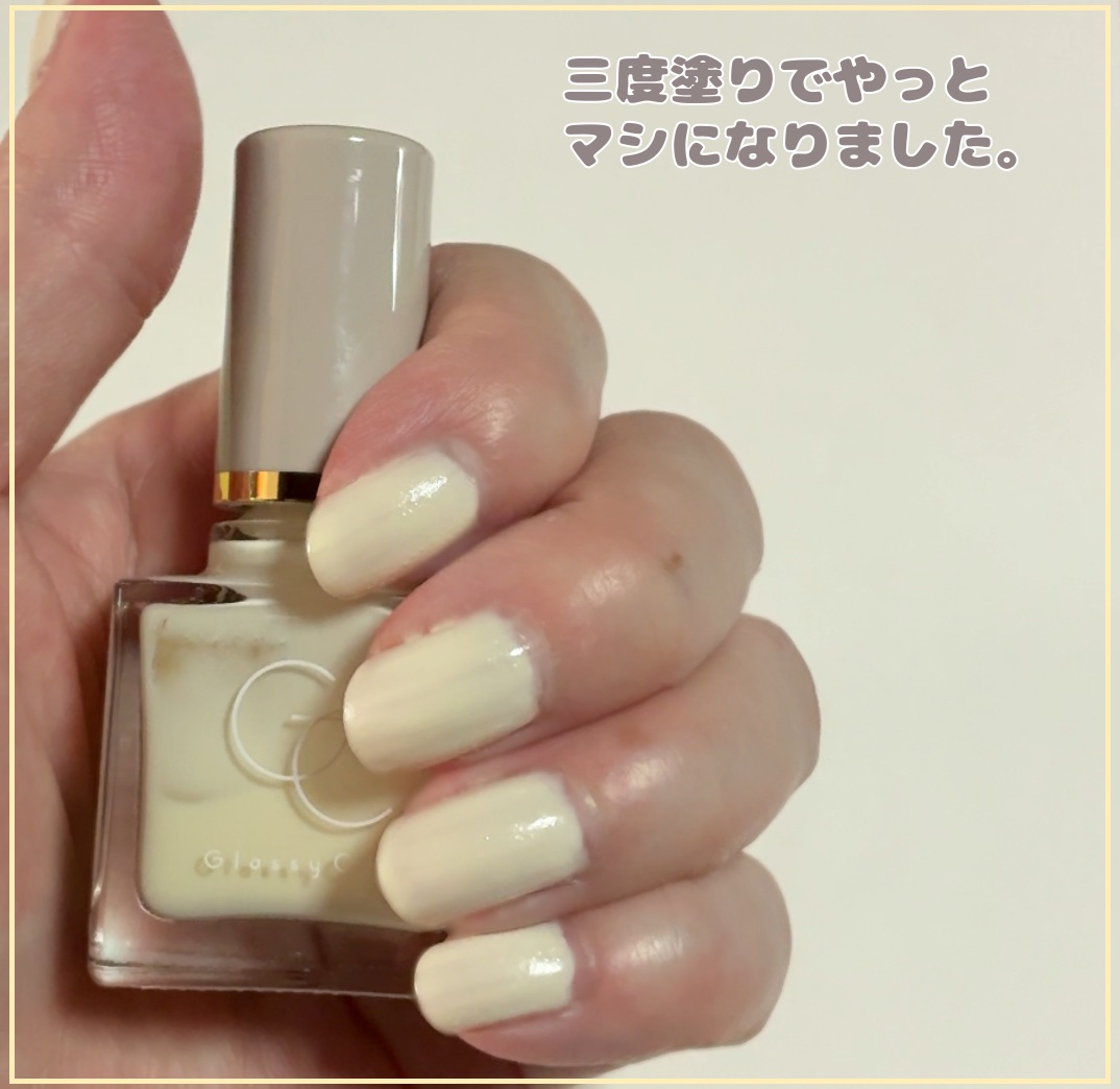 スキューズミー グロッシーコートアンバーホワイト 3度塗り黄味がかったホワイトですややムラになりやすいので、3度塗しました3度塗りするとしっかりホワイトに発色します真っ白というより薄い黄色という感じで柔らかさがあります公式の写真だと黄緑とか黄色に見えたので、ブルベには合わないかなと思いましたがそこまで黄色ではなかったので、使いやすそうですニュアンスネイルにも使えそうです