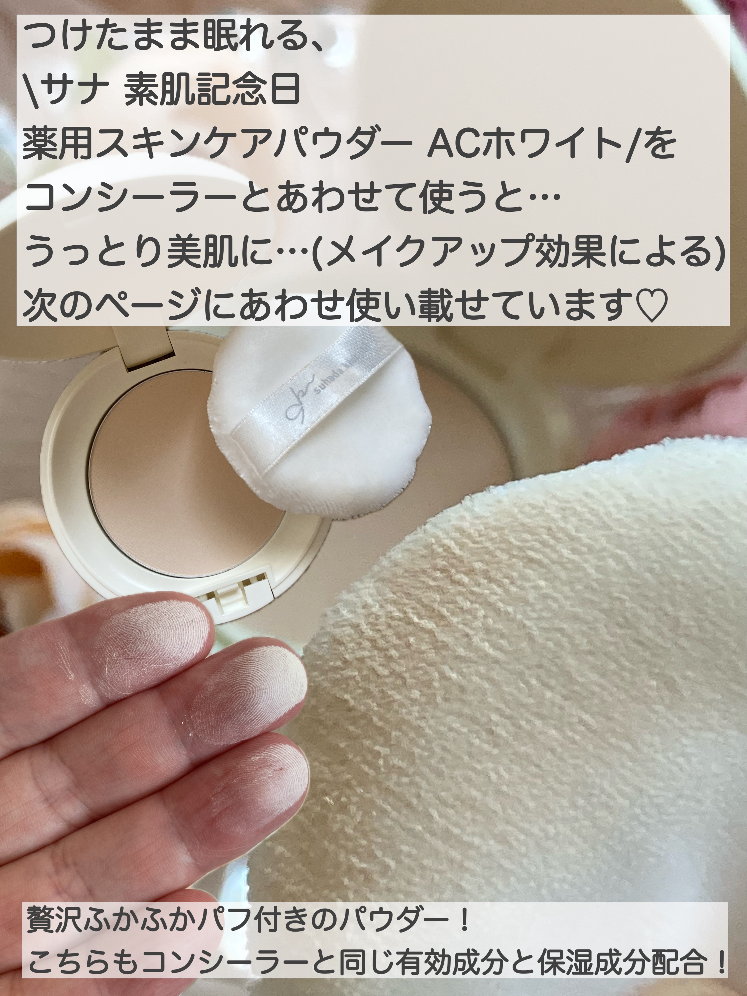 PRTIMES主催のイベントに招待されましたitem▷#SANA#素肌記念日#薬用スキンケアパウダーACホワイト肌あれ予防のグリチルレチン酸ステアリルと美白ケアのトラネキサム酸、Wの有効成分配合のプレストパウダー。薄づきながら赤みやくすみを補正してくれるホワイトベージュ系のパウダーは朝はフェイスパウダーとして、夜はナイトパウダーとしてスキンケアの仕上げに24時間いつでも使用できます。3種のセラミド※1やビタミンC誘導体※2、ツボクサエキスでお肌を乾燥から守りつつ、アミノ酸コーティングパウダー※3で密着させ皮脂コントロールパウダー※4でさらさら感が持続。ブルーライトカット成分※5inも配合されていてすっぴんでいるよりもお肌に優しく過ごせます。鉱物油/石油系界面活性剤/パラベン/タール系色素不使用、ノンコメドジェニックテスト済み。ほんのりと香るホワイトティーの香りも癒されます。付属のふかふかな触れ心地の贅沢パフもリニューアルでサイズアップしたことで、さらにささっと塗布しやすくなりました。..※1N-ステアロイルフィトスフィンゴシン、ヒドロキシステアリルフィトスフィンゴシン、N-ステアロイルジヒドロスフィンゴシン ※2リン酸L-アスコルビルマグネシウム ※3ステアロイルグルタミン酸2Na(基剤)、セリサイト(基剤)、水酸化アルミニウム(基剤)※4無水ケイ酸(基剤) ※5微粒子酸化チタン(基剤)#薬用スキンケアパウダー#フェイスパウダー#ナイトパウダー#お泊まりメイク