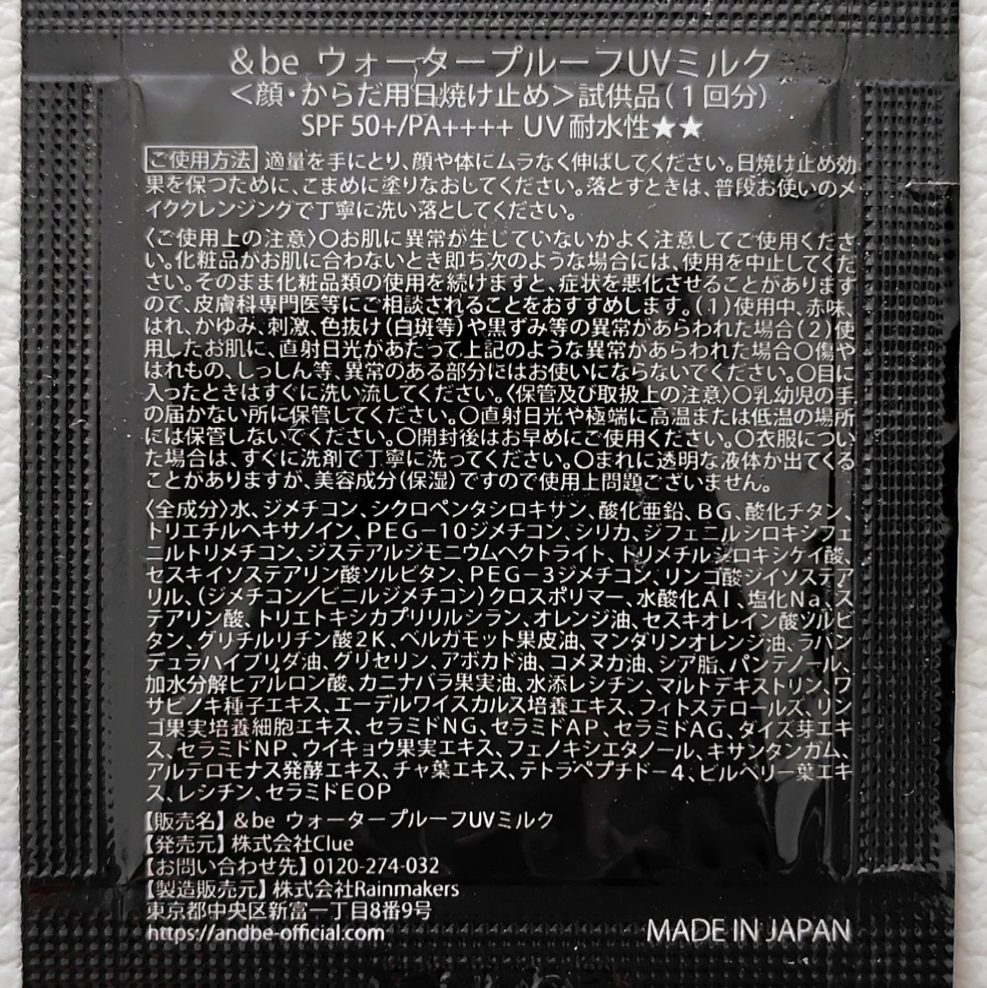 こんばんは、コンパスです😌今回は、サンプルレビューです🤗◆&be &beウォータープルーフUVミルク サンプル◇テクスチャー フツーの乳液という感じ。 サラサラでも、硬くもない。 強いて言うなら、少しフワっとした乳液?◇使い心地 しっとり。時...