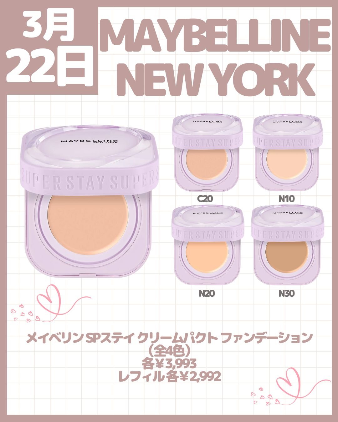 2025年春コスメ発売日カレンダー【3月/第10弾】3月22日(土)~27日(木)発売こんにちは!kumasakuです🐻@ckumacom▲過去の投稿はここからチェック♡2025年春コスメ【3月発売】の「コスメカレンダー」を複数回にわけて紹介しています!【第1弾】https://lipscosme.com/posts/7285410【第2弾】https://lipscosme.com/posts/7296765【第3弾】https://lipscosme.com/posts/7304248【第4弾】https://lipscosme.com/posts/7311268【第5弾】https://lipscosme.com/posts/7319061【第6弾】https://lipscosme.com/posts/7330579【第7弾】https://lipscosme.com/posts/7338120【第8弾】https://lipscosme.com/posts/7344698【第9弾】https://lipscosme.com/posts/7352069保存して欲しい新作コスメを見逃さないように🐻【コスメカレンダー】■3月22日(土)発売→#アリィー(#ALLIE)→#KATE(#ケイト)→MAYBELLINENEWYORK(#メイベリンニューヨーク)■3月24日(月)発売→#AMUSE(#アミューズ)→#KiSS(#キス)→#キスミーフェルム(KISSMEFERME)■3月26日(水)発売→#MISSHA(#ミシャ)→L'OCCITANE(#ロクシタン)■3月27日(木)発売→#REVLON(#レブロン)次回も話題の新作コスメの最新情報などご紹介しますのでお楽しみに!------------------------------------※画像はLIPS様よりお借りしました。#新作コスメ#コスメカレンダー#コスメ情報#コスメ紹介#プチプラ#プチプラコスメ#ドラコス#バズ#バズコスメ#バズりコスメ#新作#新色#限定色#限定品#メイクアップ#おすすめ新作#限定#春メイク#ピンクメイク#ピンクコスメ#プチプラ新作#垢抜け#垢抜けメイク#韓国コスメ#韓国メイク#韓国コスメ新作#UVケア#日やけ止め#ベースメイク#ファンデ#ファンデーション#アイライナー#涙袋#涙袋メイク#ティント#ティントリップ#リップ#クッションファンデ#クッションファンデーション#ルースパウダー#フェイスパウダー#ボディケア#ハンドケア#ハンドクリーム#美容液#美白ケア#プレストパウダー#下地#コスメ#美容#コラボコスメ#サンリオコラボ#クロミ#クロミコラボ