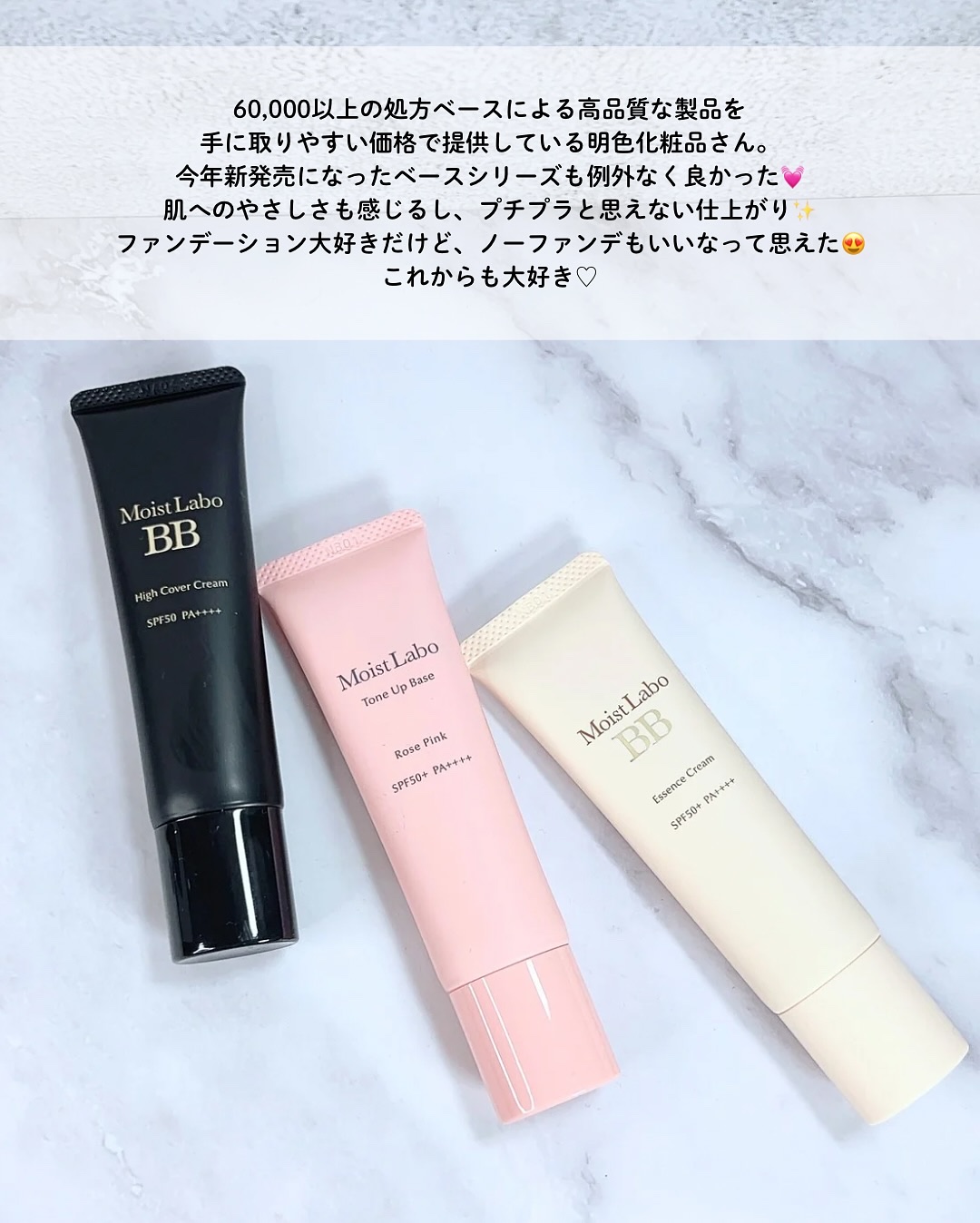 @natsu.beautyandhealth国内老舗化粧品ブランドのBB&下地がすごい🥰✨・。・。・。・。・。・。・。・。・。MoistLabo(@meishoku_corporation)🖤ハイカバー薬用美白BBクリーム¥1,300(税抜)🩷トーンアップ下地¥1,200(税抜)🤍BBエッセンスクリーム¥1,300(税抜)・。・。・。・。・。・。・。・。・。130年以上の歴史を持つ日本の老舗化粧品ブランド、明色化粧品さんから商品をご提供いただきました✨以前ご紹介したアイテムは今も愛用してます🥰使い心地の良さとお値段が良い意味で全然合致してなくて、ブランドさんの想いやこだわりを製品から感じられます🥹💓そんな明色化粧品さんから今年新発売になったBBクリームと化粧下地をご紹介🥰🖤ハイカバー薬用美白BBクリーム薄付きでありながらコンシーラー級のハイカバーを叶えた高機能BB✨ナイアシンアミド配合でシワケアや美白対策もできちゃう上に、ウォータープルーフ、SPF50・PA++++☀️これひとつで美容液、クリーム、UVカット、化粧下地、コンシーラー、ファンデーションと6つの効果があるのも驚き😍🩷トーンアップ下地(ローズピンク)毛穴や色ムラをカバーするローズピンクと毛穴・黄ぐすみをカバーするラベンダーの2色✨ローズピンクは自然で華やかな印象の仕上がり😍汗水に強く、SPF50+PA++++と夏場の対策にも🥰グルタチオン・ナイアシンアミド配合でスキンケアをしてるような使い心地✨🤍BBエッセンスクリーム(シャイニーベージュ)微細な水光パールを含んだBBクリーム😍小ジワや毛穴、くすみをぼかして透明感のあるみずみずしいツヤ肌を演出✨こちらもSPF50+PA++++で1つで6役🥹💓(美容液、クリーム、UVカット、化粧下地、コンシーラー、ファンデーション)ナイアシンアミド配合でシワケアも🥰3つのアイテムがすべて1,000円台なのが信じられない😂ファンデ大好きな私だけど、ノーファンデもいいなって思えたくらい仕上がりが綺麗でした✨多様なニーズに合わせて研究と進化を続けている明色化粧品さん、ぜひチェックしてみてください🥰@meishoku_corporation#PR#明色化粧品#モイストラボ#BBクリーム#ベースメイク#化粧下地#スキンケア#桃谷順天館