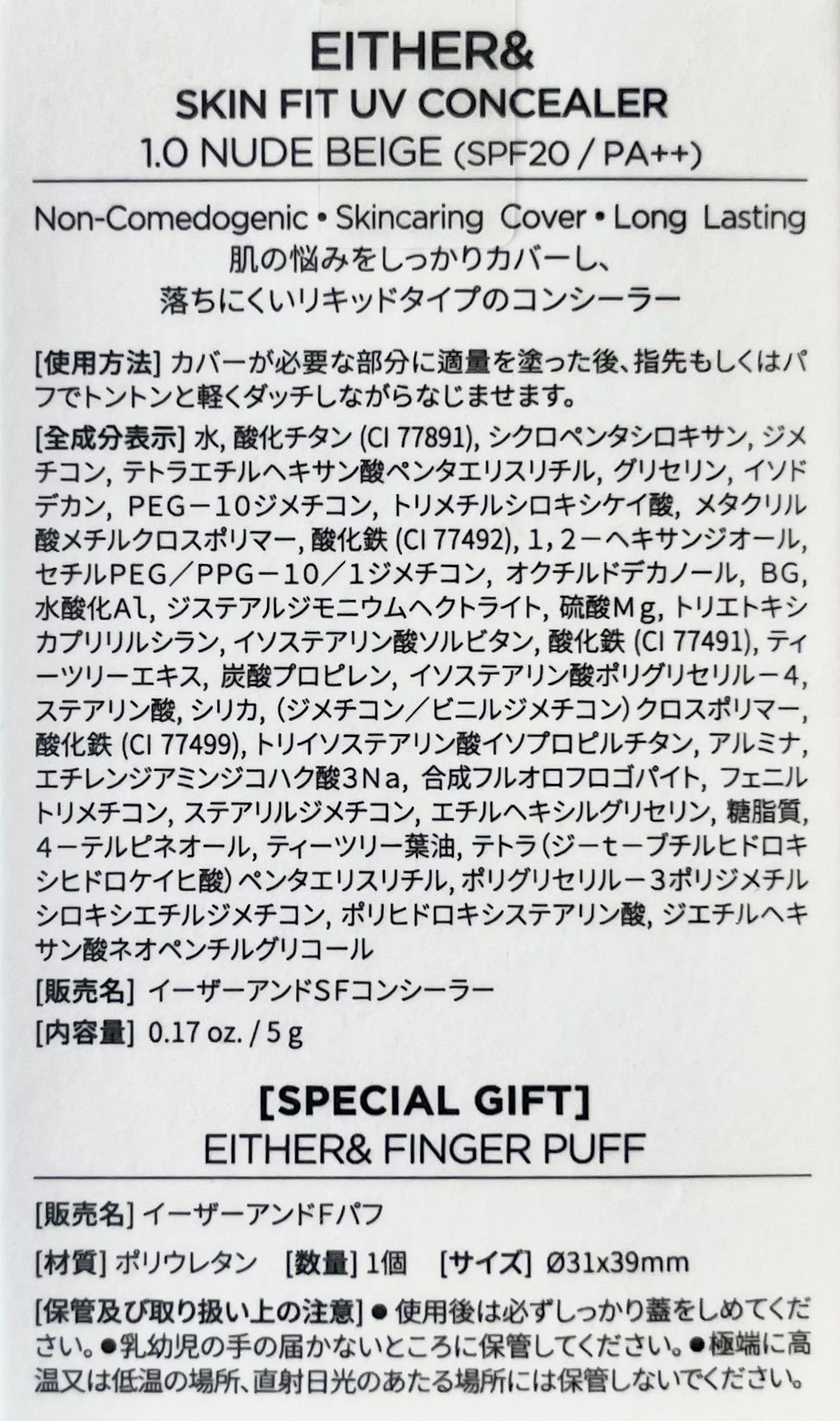 EITHER&さまよりいただきました!SKINFITUVCONCEALERスキンフィットUVコンシーラー1.0NUDEBEIGE(SPF20PA++)パフ付き\\塗り心地良くて使いやすい💕//リキッドタイプのコンシーラー。しっとりと伸ばしやす...