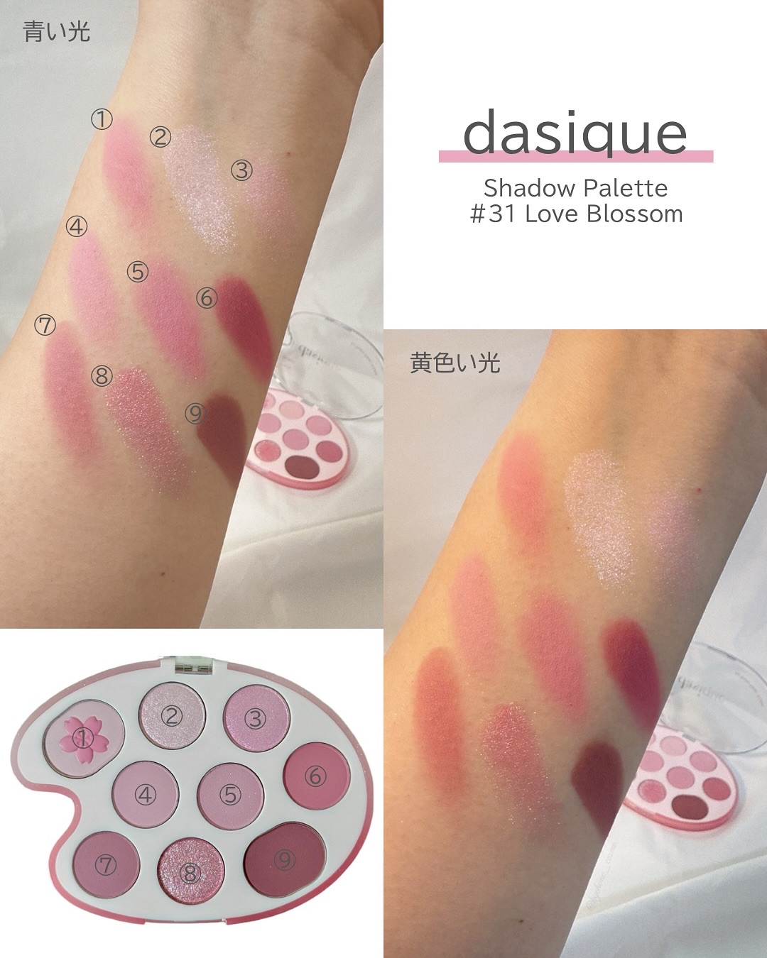 dasiqueシャドウパレット31ラブブロッサム🌸dasiqueの桜パレットのブルベカラーラブブロッサムを購入したのでレビューします!【色味】青みピンク【ラメorマット】ラメ×3、マット×5、ラメ入りマット×1【密着感】★★★★☆【発色】★★...