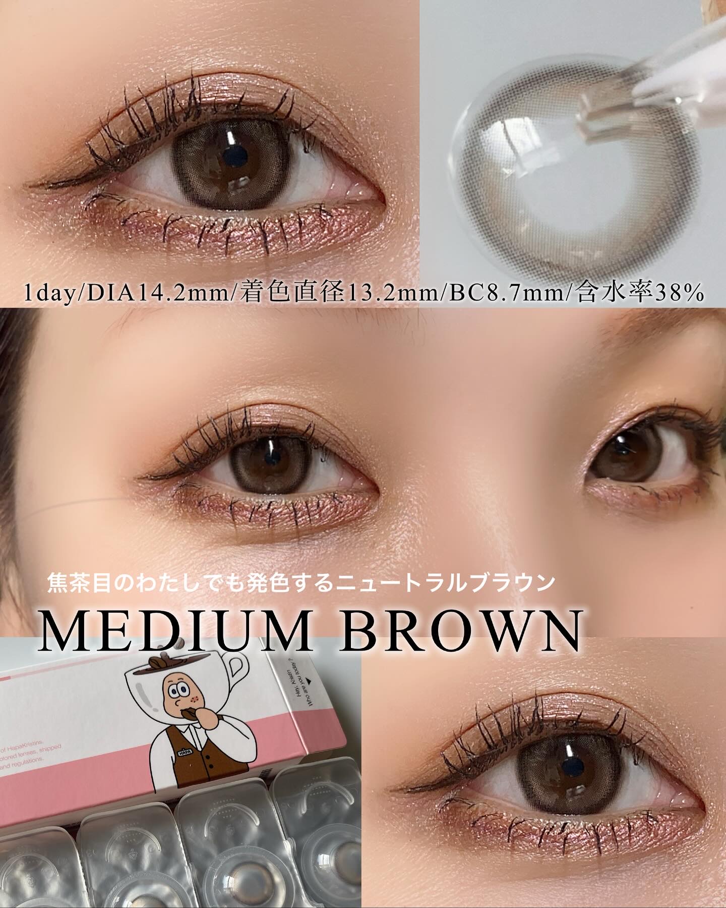 奥目さんにおすすめ!!ちゅるんとした瞳になれるブラウン!!HapaKristinBeanKristin1DayMEDIUMBROWN1Day10枚入りDIA14.2mm着色直径13.2mmBC8.7mm含水率38%こちらは、奥目さんにおすすめ...