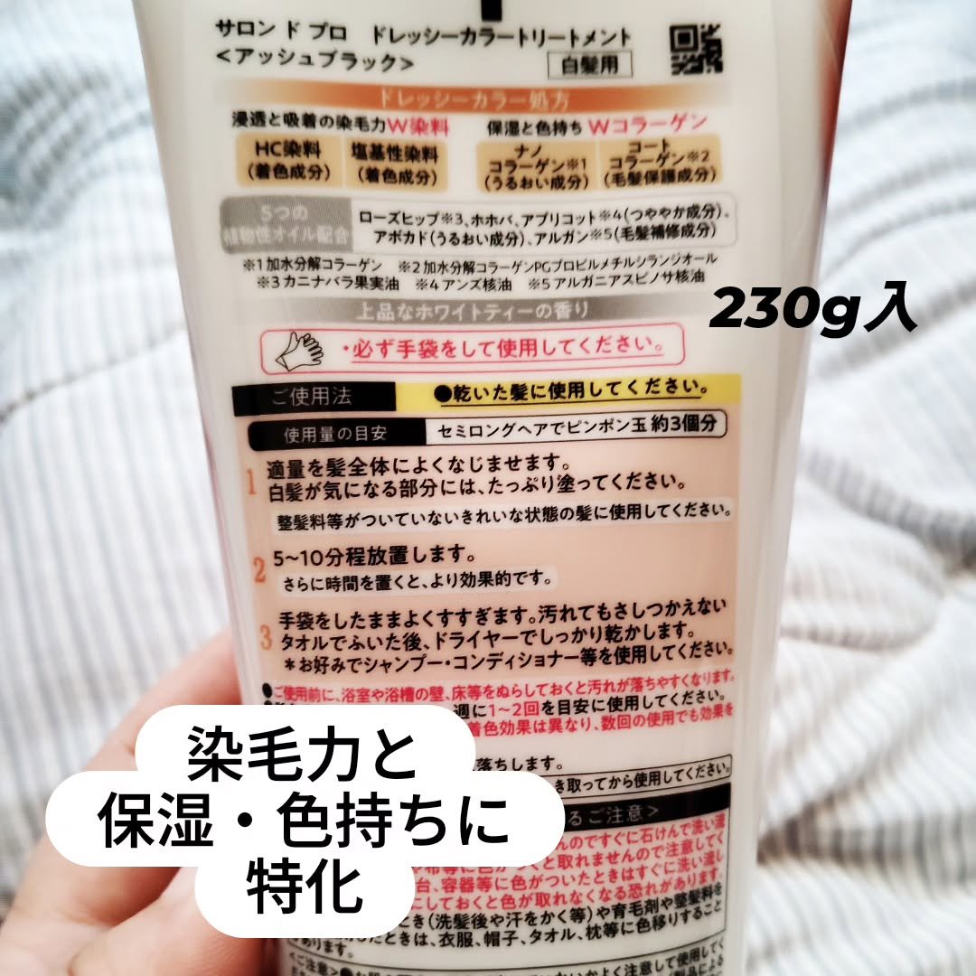 #サロンドプロ#ドレッシーカラートリートメント#購入品1週間弱使用してみました!※SalondePROサロンドプロDressyColorTreatmentドレッシーカラートリートメントアッシュブラック230g販売価格1,200-1,500円これ発売されてすぐだったみたいで口コミほとんど無かったですね☆2枚目画像商品名間違えました。申し訳ありません🙇◇使用した感想初日は説明書通りに乾いた髪にカラートリートメントを全体にみっちり塗布する髪にしっかり密着するテクスチャーなので、ボトッと落ちてくることは無かった汗と混ざって色水が落ちてくることはあった時間をおいてから、しっかりすすぐその間にバスタブやら床やらに色がついてて、沢山掃除をした とても焦った💦風呂掃除用の洗剤も必要です(賃貸なら特に)初日は今まで元ヤンチックな非常に明るい赤茶色だった髪が落ち着いた黒髪になんとか戻った白髪や塗り忘れのあった箇所以外はアッシュ系の柔らかい黒色になったその後はシャンプー後しっかりタオルドライしても使えると説明書にあったので、その方法で2日間塗布して染める塗り忘れも染まったし、白髪にもある程度は色が入った全体的に自然なツヤのある髪になったこちらは「ツヤ染め」を謳うだけあって自然なツヤがあってパサつきやダメージも少ない印象これからは週1-2回で使っていきたいです◇注意点すすぐときに青の染料が流れて来たあとに黒の染料が流れてくるしっかりすすがないとタオルにしっかり色がつく髪をすすいだあとはすぐにタイルや浴槽を掃除しないと色がつく(青色が特に付着する)その日に色が落ちなくても、毎日掃除してたら色が落ちる掃除用のバススポンジと洗剤は必須ドラッグストアによって値段の変動ありウェルシアでは1,500円+税で販売されてた自分の行きつけのドラストでは高齢者が多い地域のせいか1,200円で販売されてます個人的には裏の説明書の字を大きくして欲しい‼️老眼にはキツい字の小ささ…お願いしますダリヤ様🙇